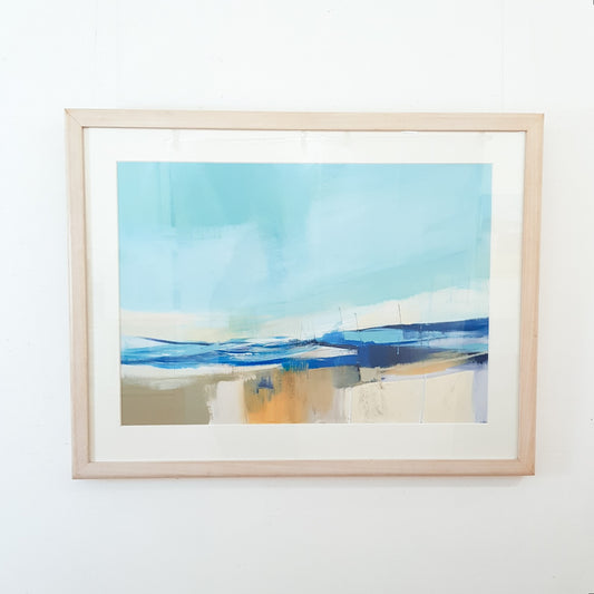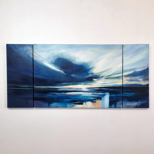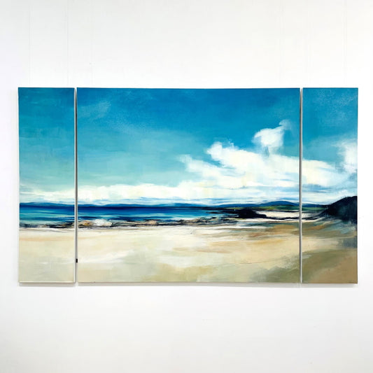 She travels regularly to the west coast and islands for inspiration. She uses household emulsion, oil, sand and varnish to create a variety of surfaces to describe the different textures found at the sea-shore and the mood and weather of the place. For Sarah, the sea remains a constant inspiration for her work.