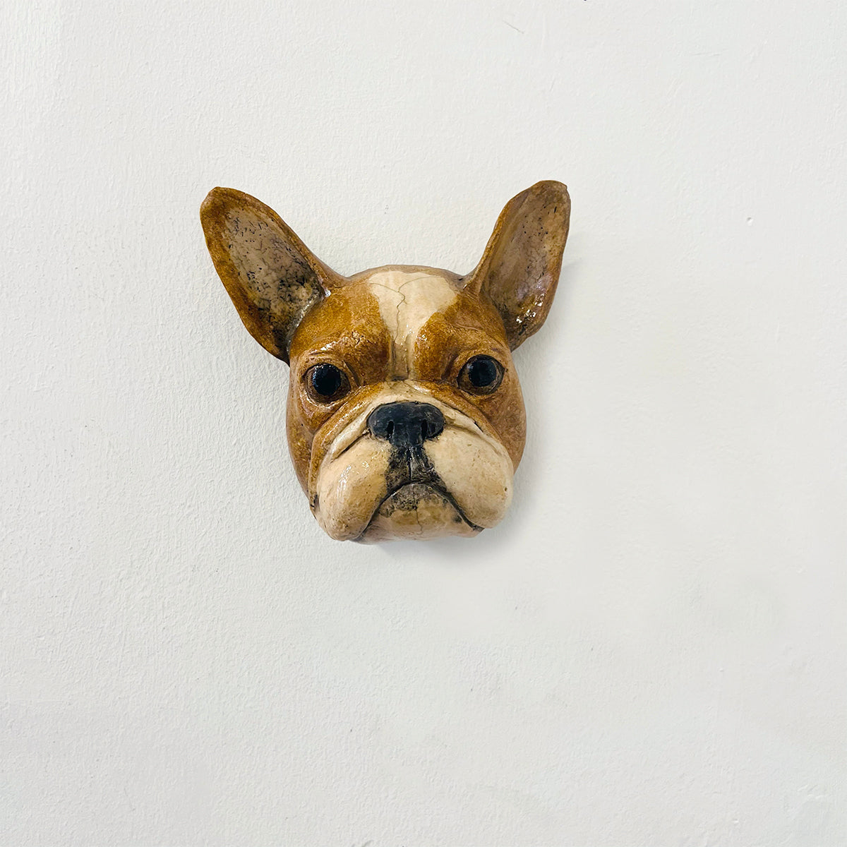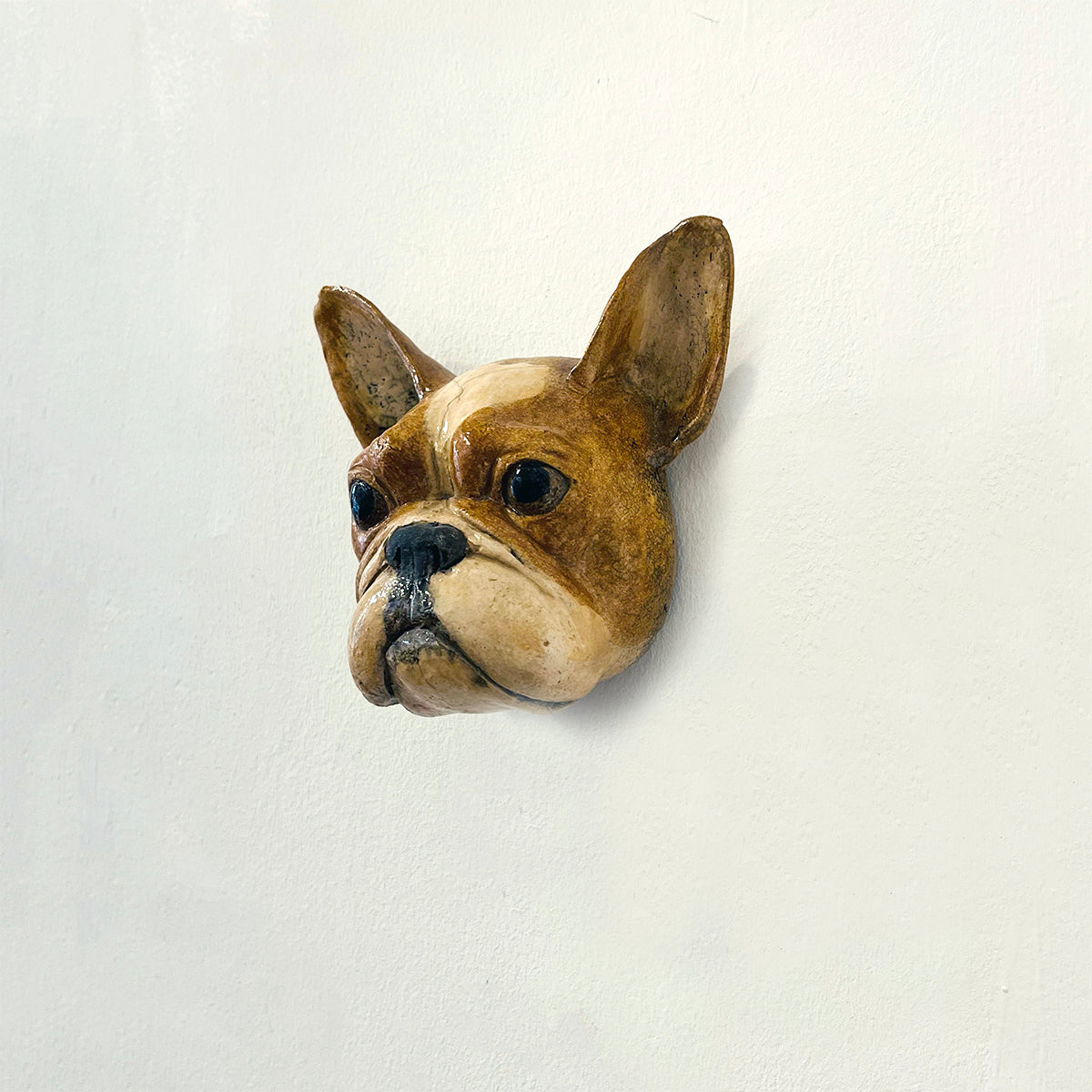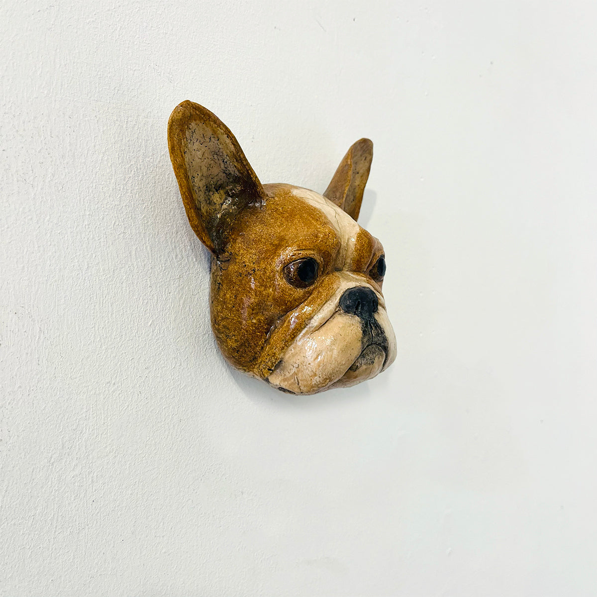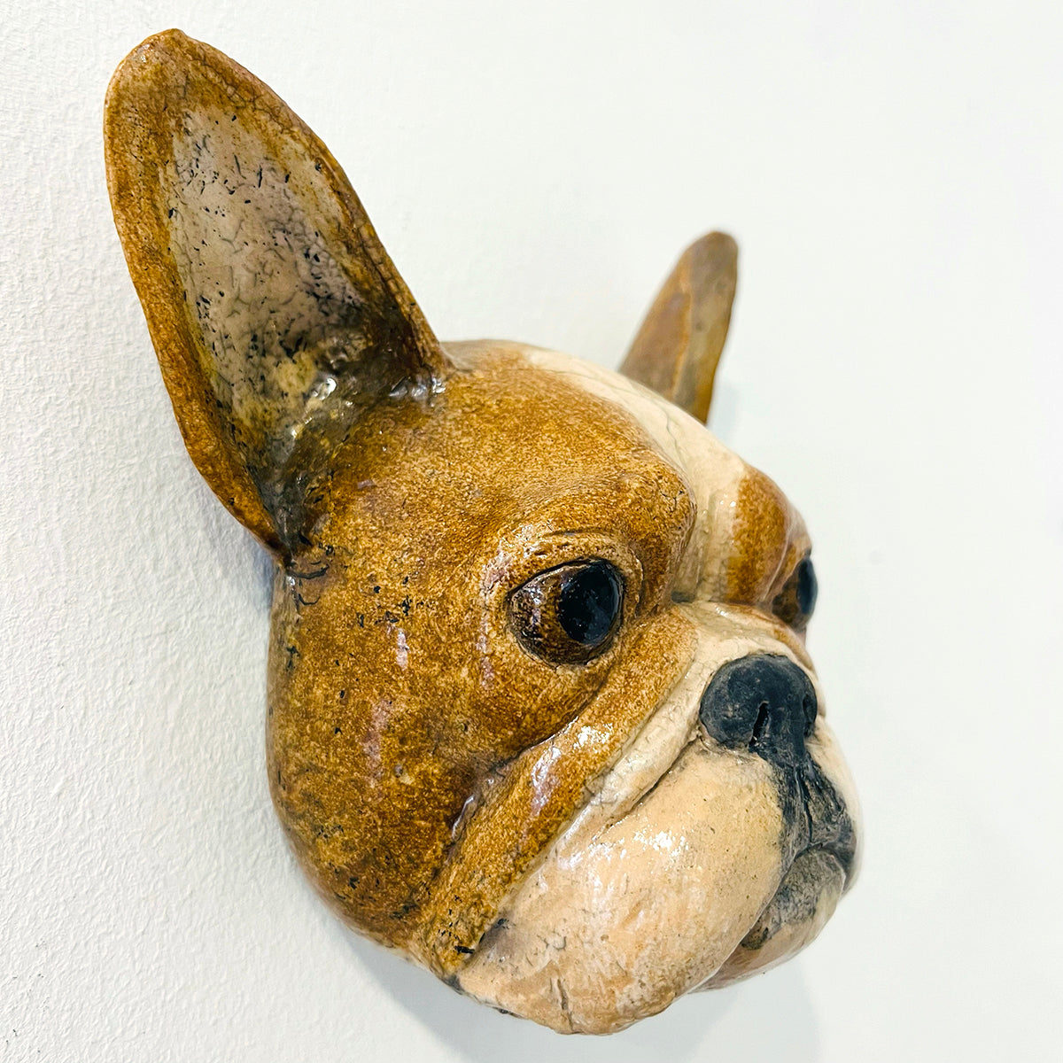 A French Bulldog looks out with attentive ears in this ceramic sculpture.