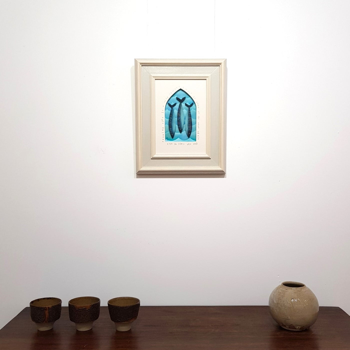 Three-dimensional fish set within an arched frame and ocean background. Golden text surrounds the central panel.
