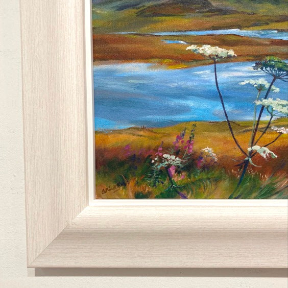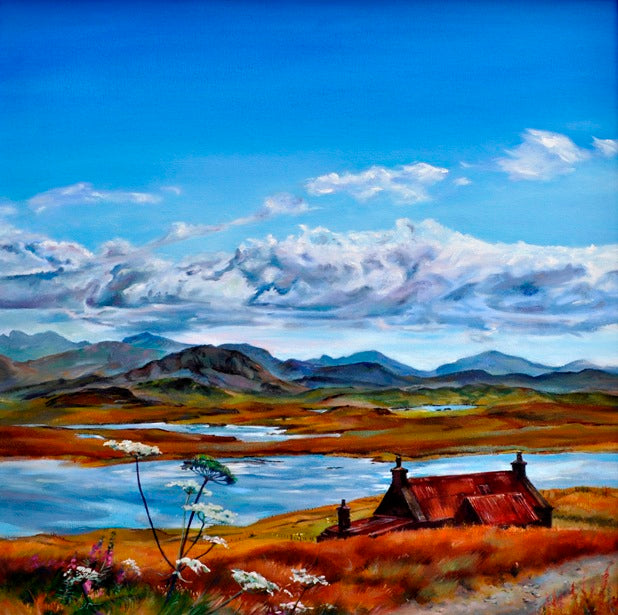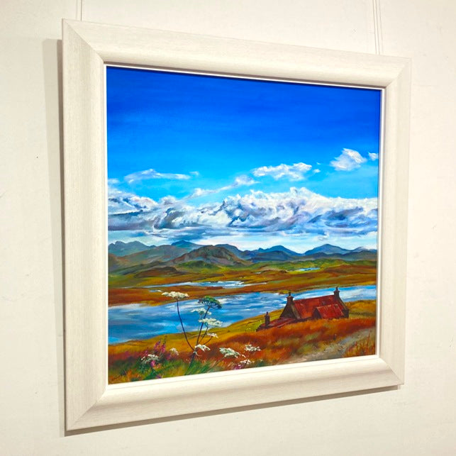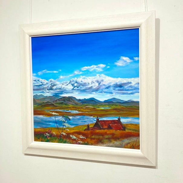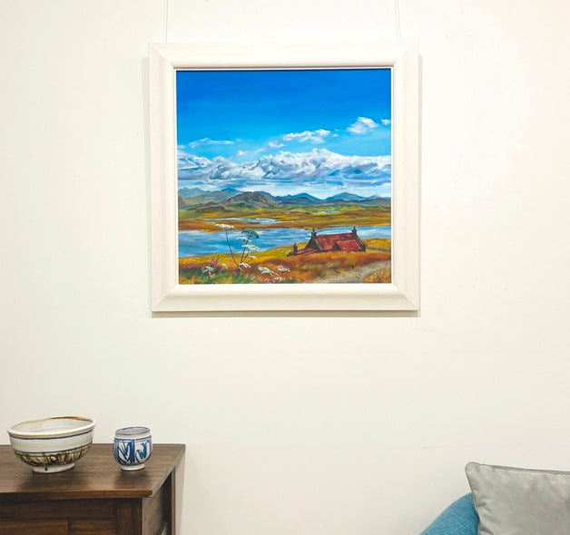 A bold painting of a house on the Isle of Lewis in the Scottish Outer Hebrides looking out to the Isle of Harris.