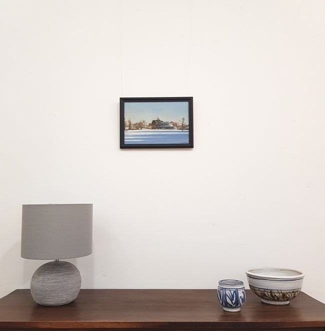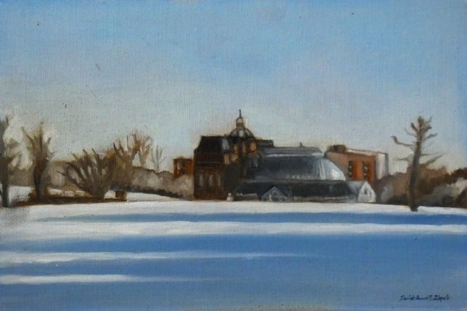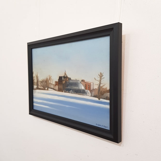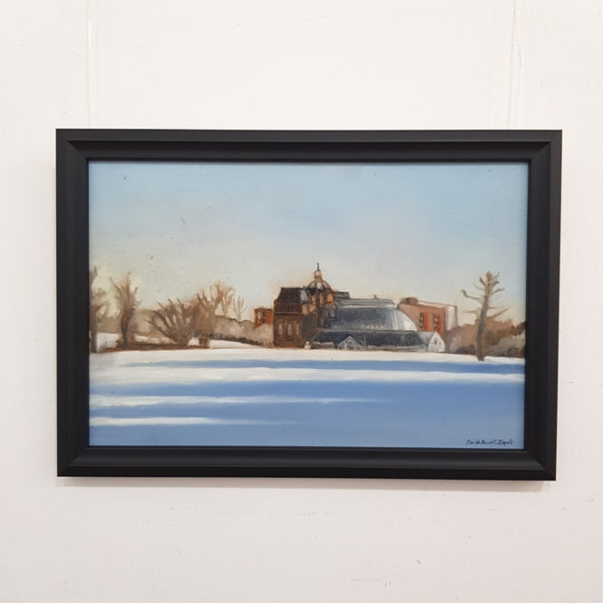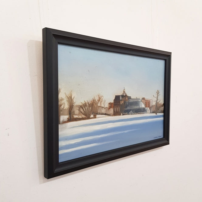 An oil painting of a snowy Glasgow Green in the East End close to Merchant City. This painting was part of the Glasgow Academy of Fine Art's emerging artist exhibition.