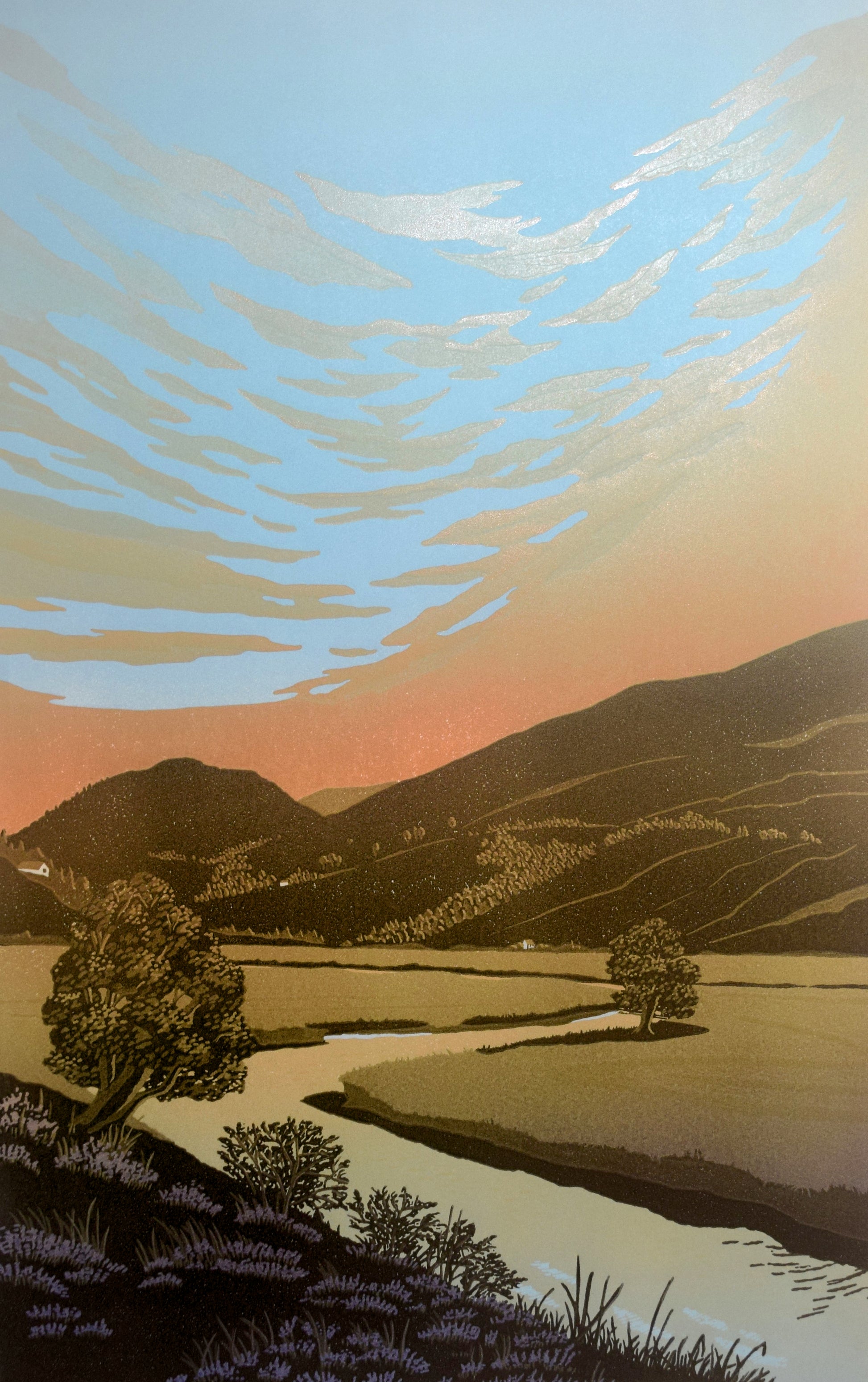 A bend in the river Dee near Braemar winds through the breath-taking Cairngorms scenery in this reduction linocut, inspired by the artist's own travels through Scotland.