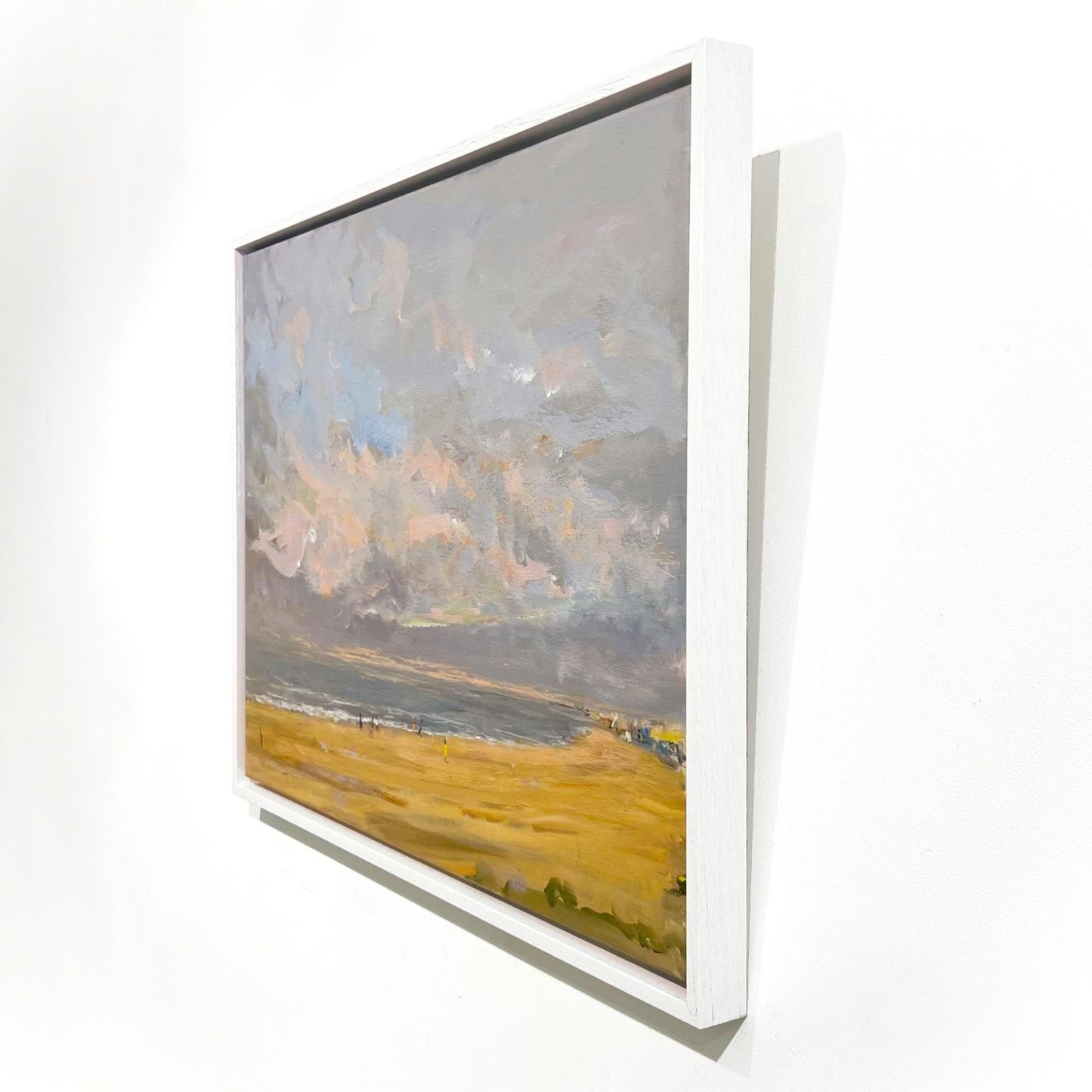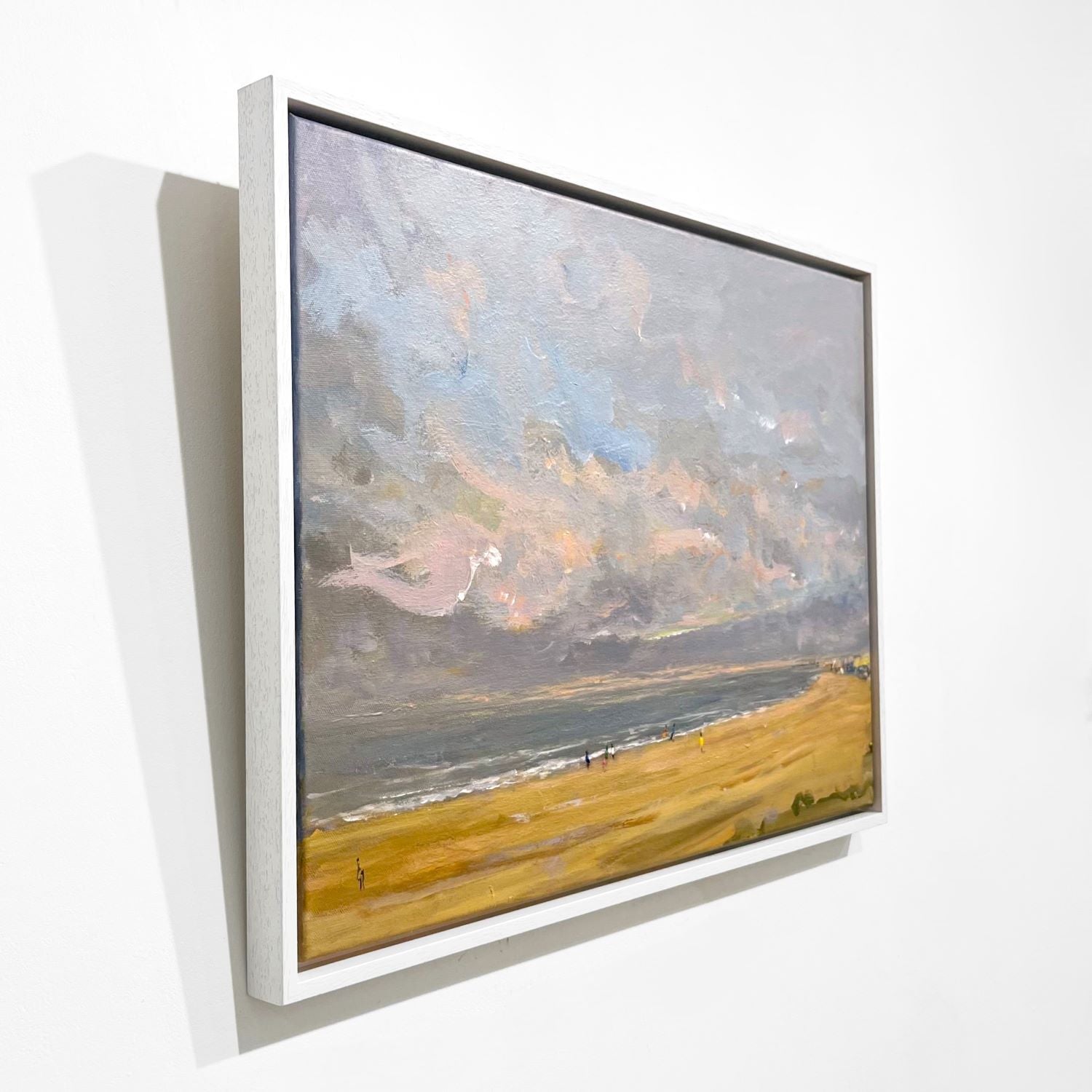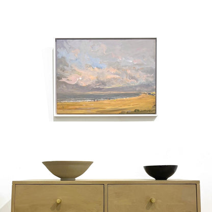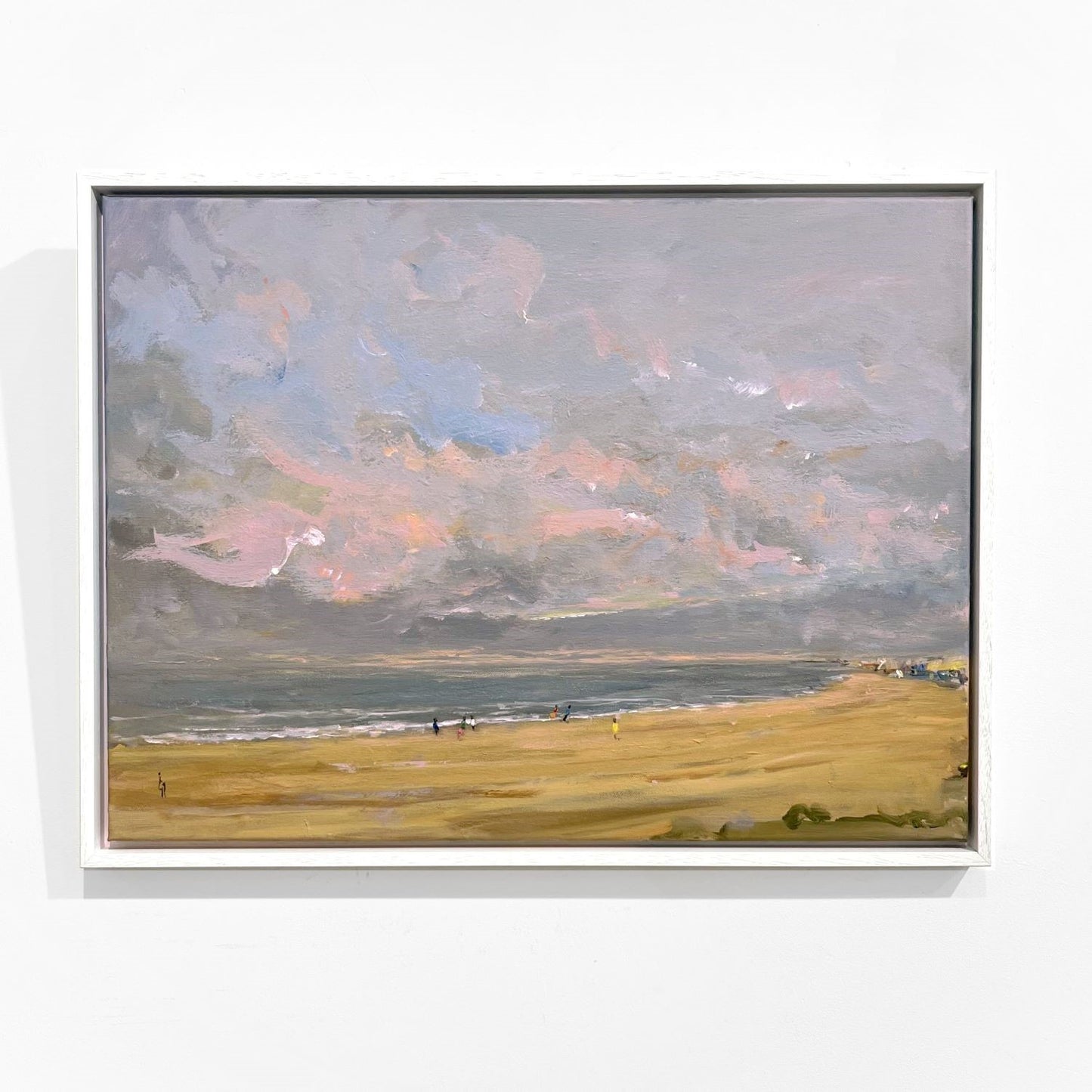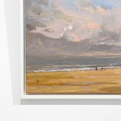 Distant figures enjoy the pastel skies brought by the sunset in this idyllic seascape.