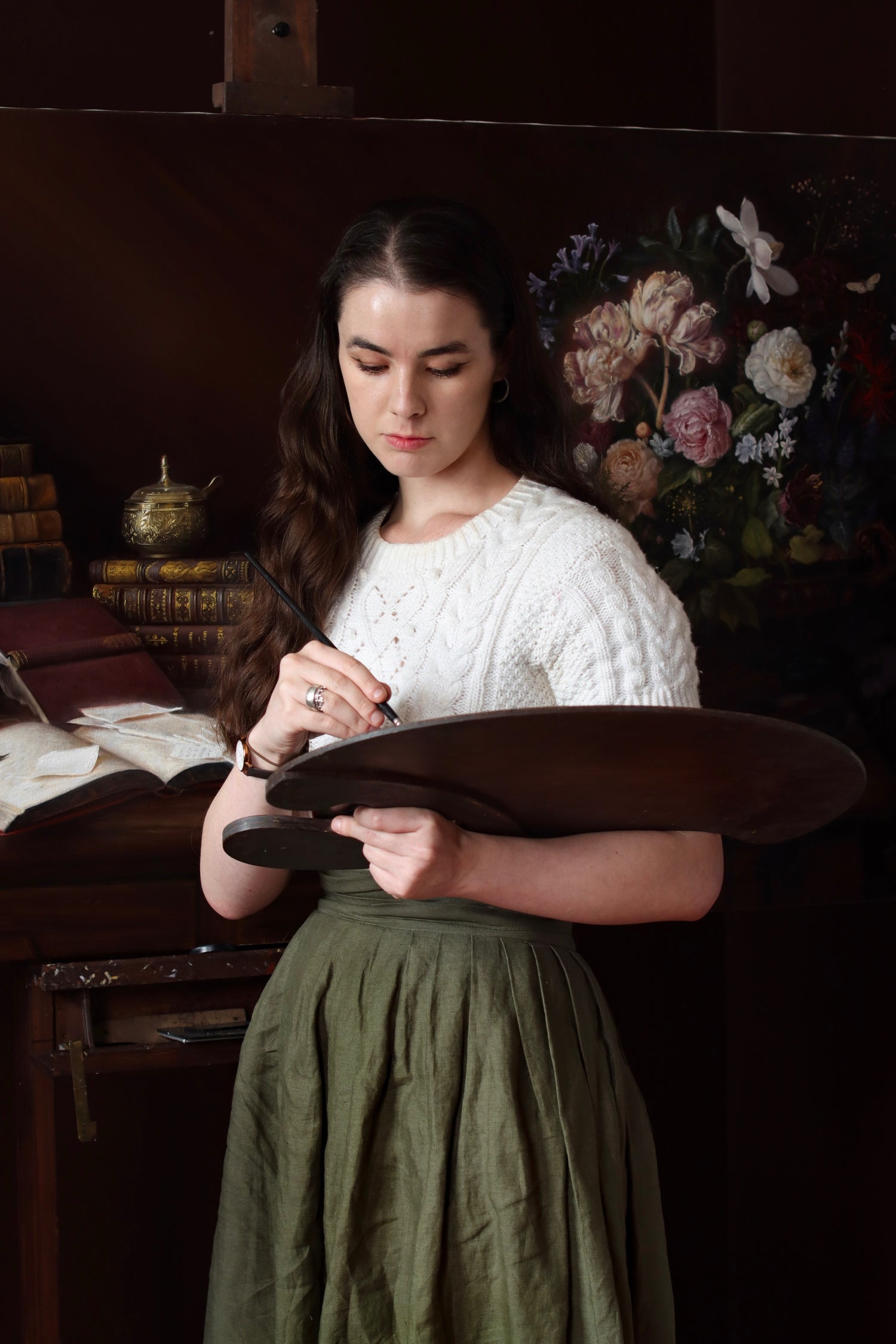 On June 23rd 2020 at 1.42am, amidst her Bachelor of Arts studies in Theatre and French, Emmanuelle Capatos (b. 2000) had the profound revelation to undertake traditional oil painting as a calling. Since that moment, she has redirected every choice to pursue this new vocation, and, in June of 2024, graduated from her atelier training at The Glasgow Academy of Fine Art. She additionally worked and taught there as assistant teacher, studio manager, and finally Anatomy Instructor.