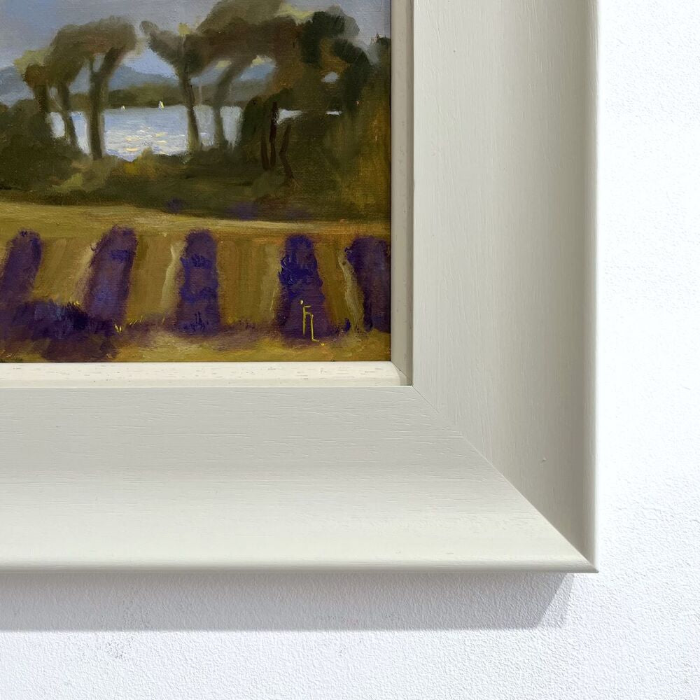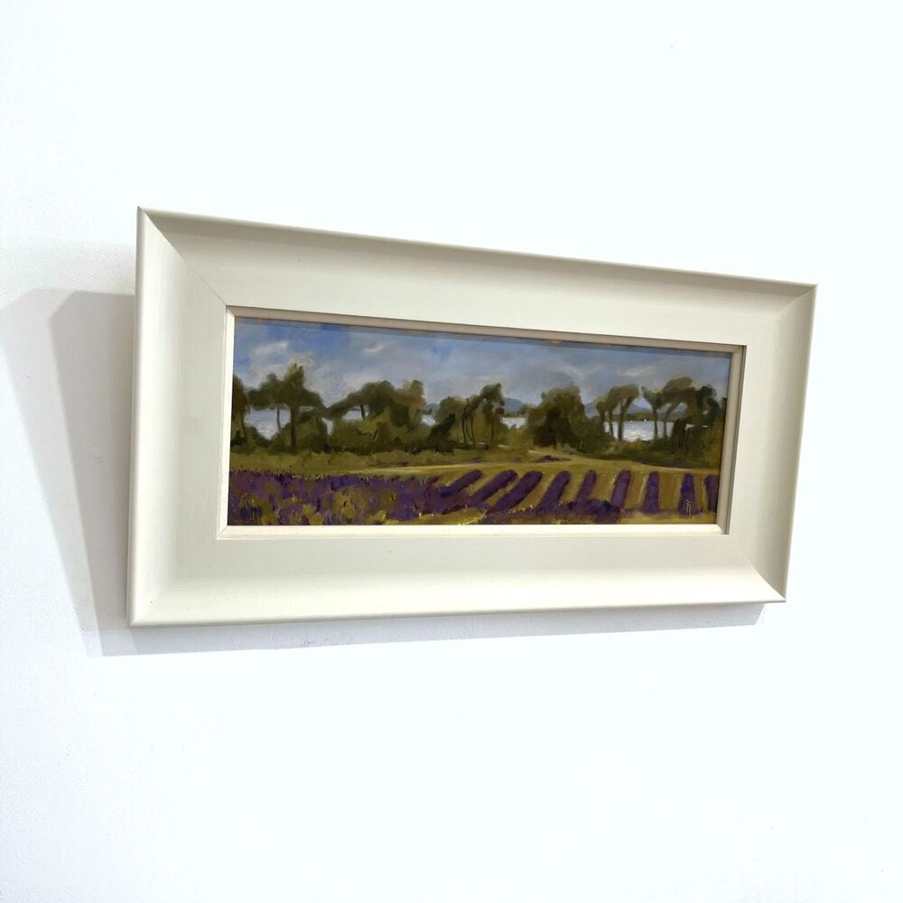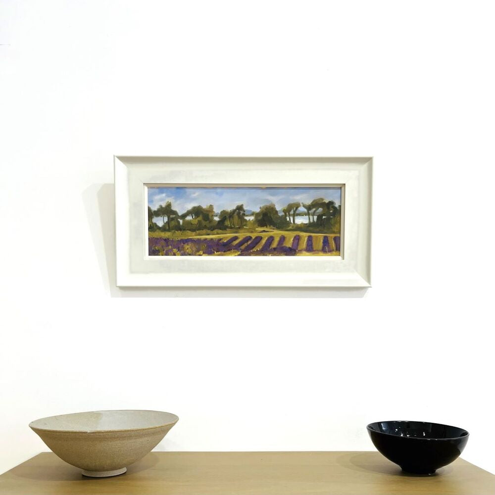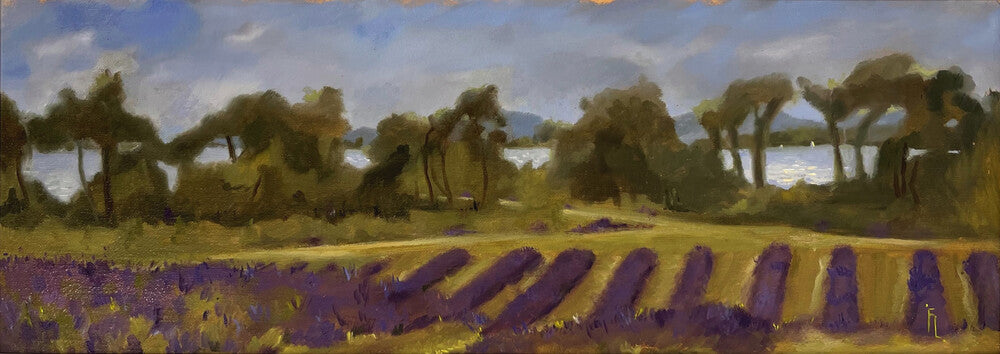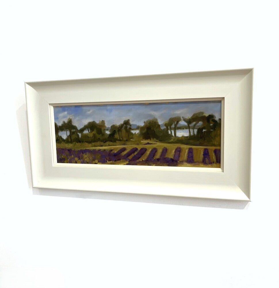 In soft greens and purples, this original oil painting shows Scotland's lavender farm by Loch Leven in Kinross.