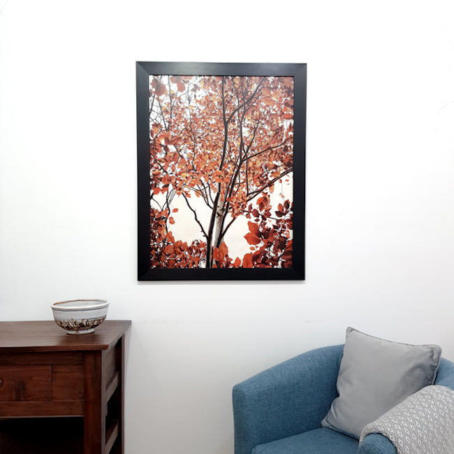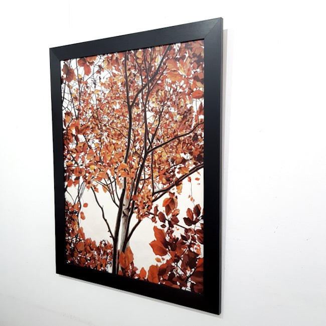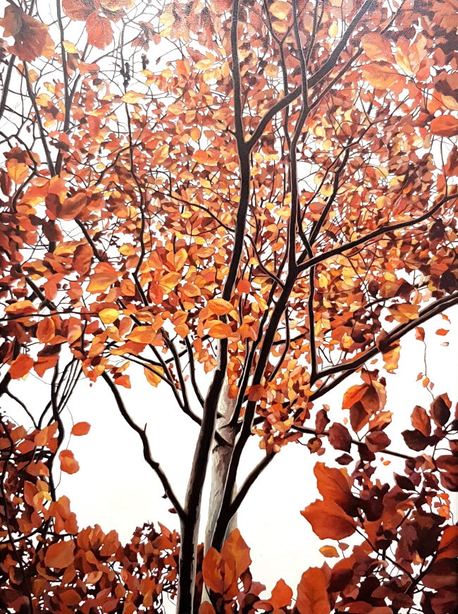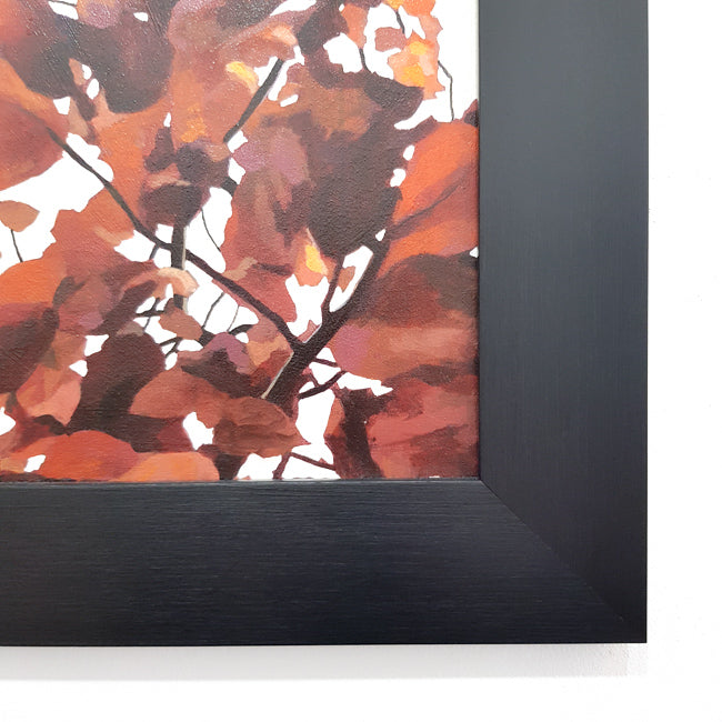 Red and burnt orange leaves fill the canvas in this original oil painting.