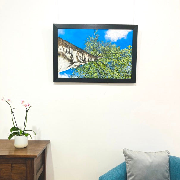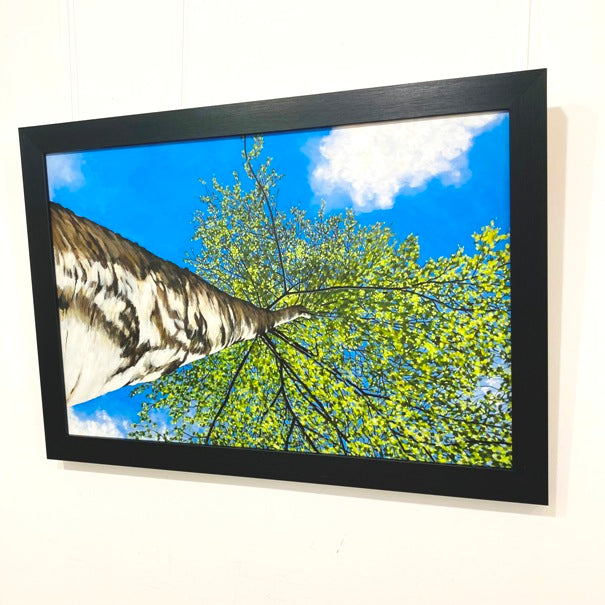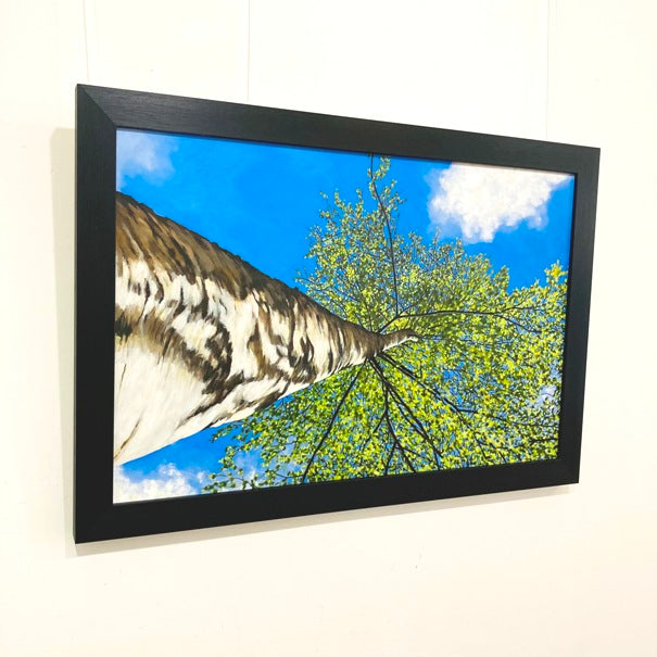 A photorealistic oil painting of a birch tree on a bright summer's day.