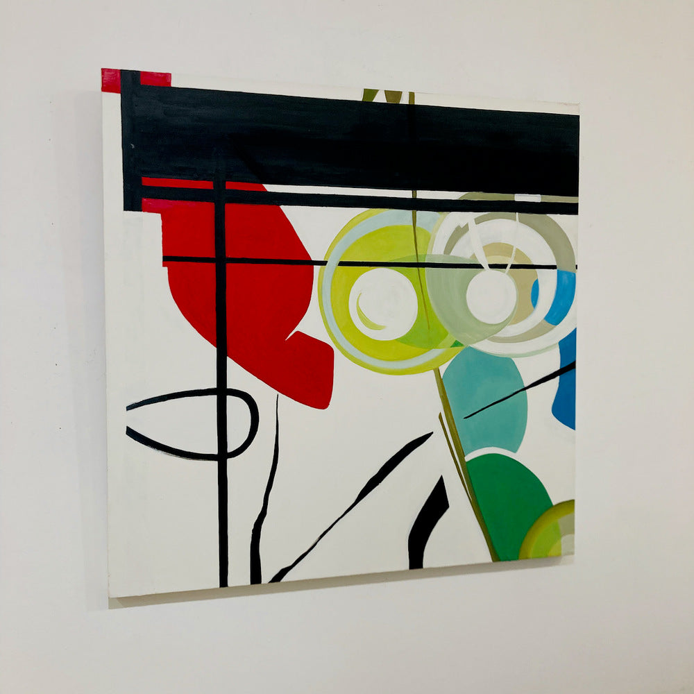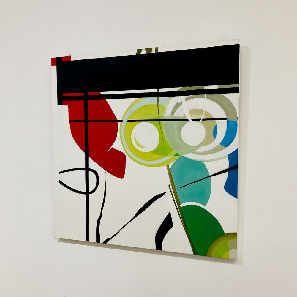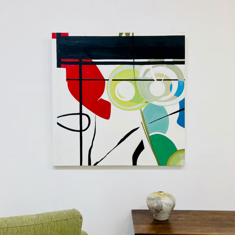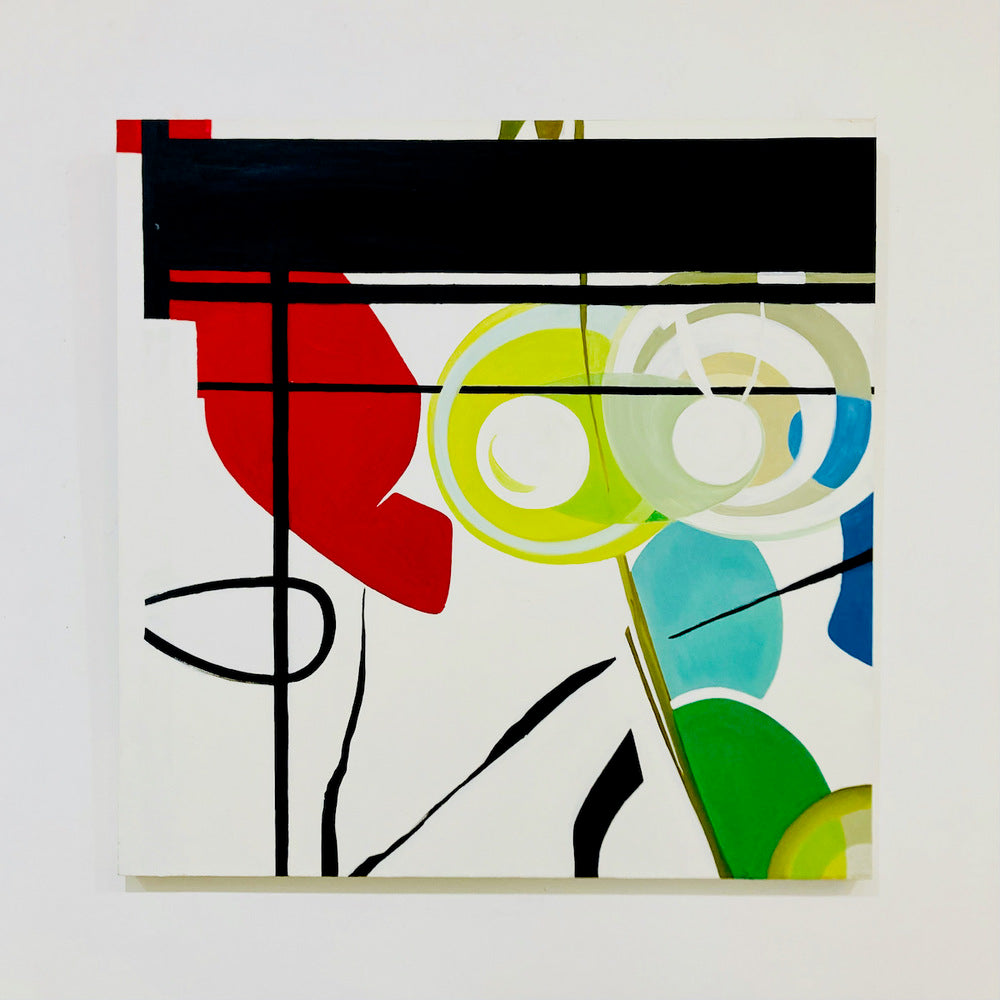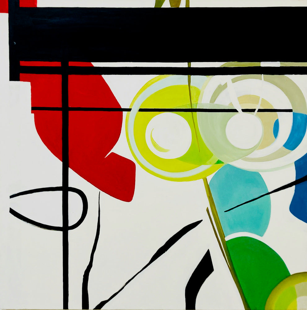 Bold black lines slice though the vivid forms in this abstract artwork.