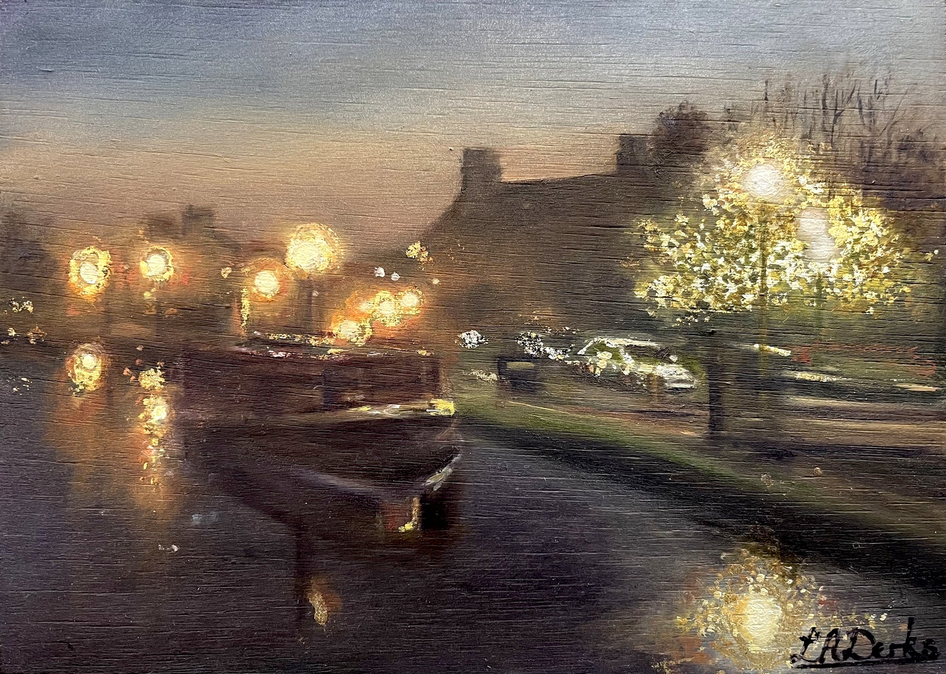 Lesley's early work was influenced by the lights of the Grangemouth petrochemical complex, leading her to paint predominantly cityscapes at night. More recently she has also begun to explore lights in other ways, focusing on interiors and the various lights they can convey.