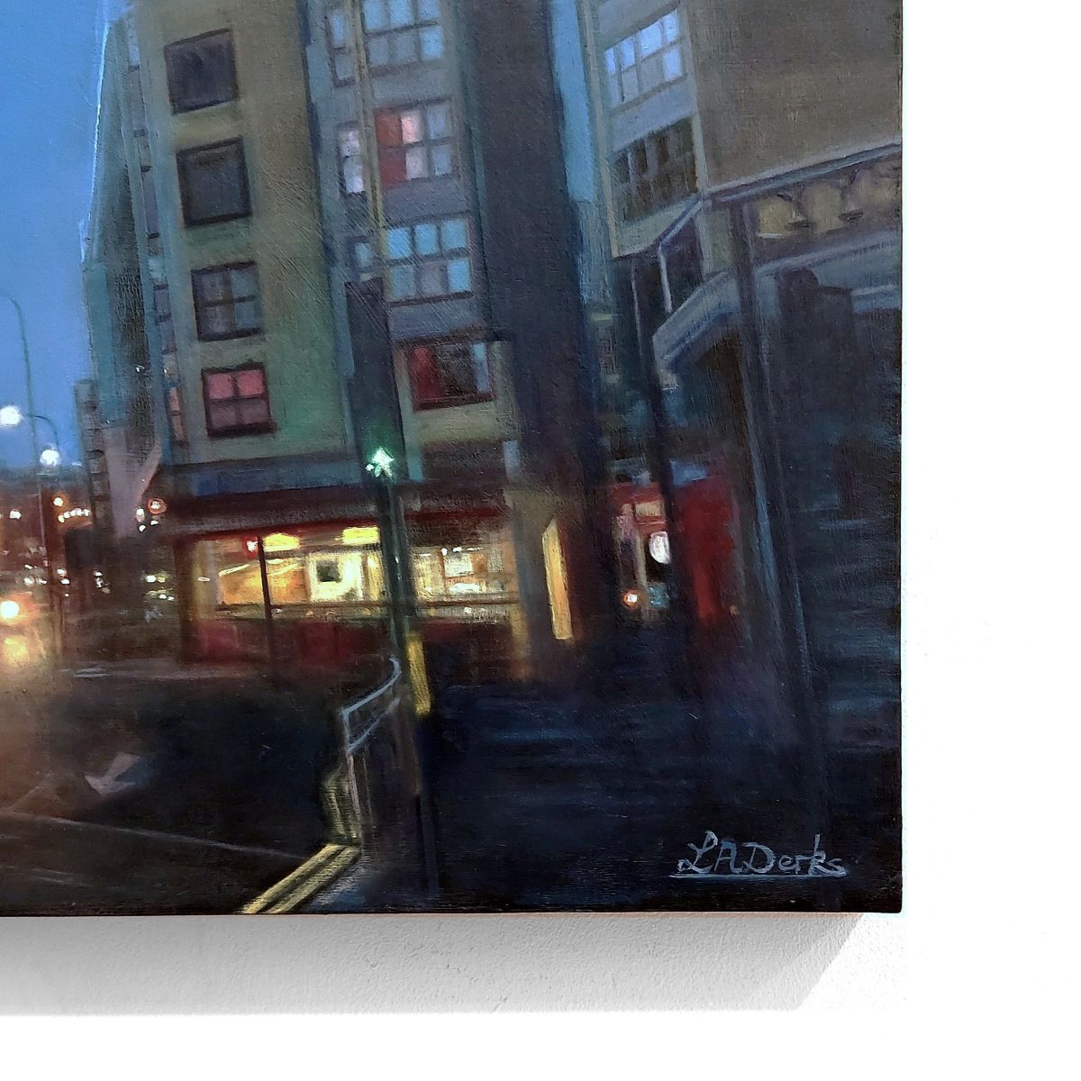 Lesley's early work was influenced by the lights of the Grangemouth petrochemical complex, leading her to paint predominantly cityscapes at night. More recently she has also begun to explore lights in other ways, focusing on interiors and the various lights they can convey.