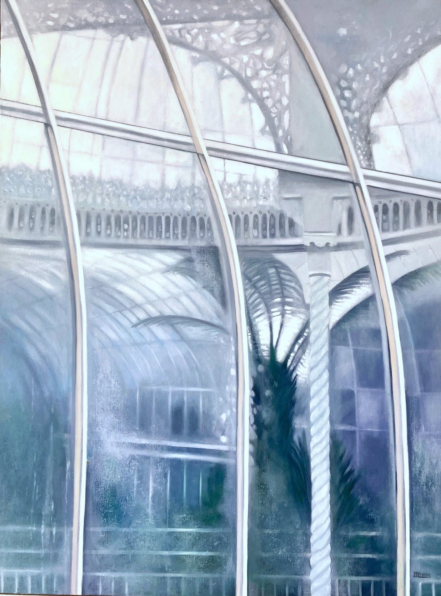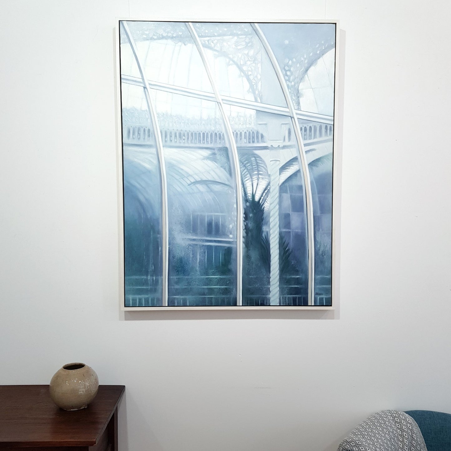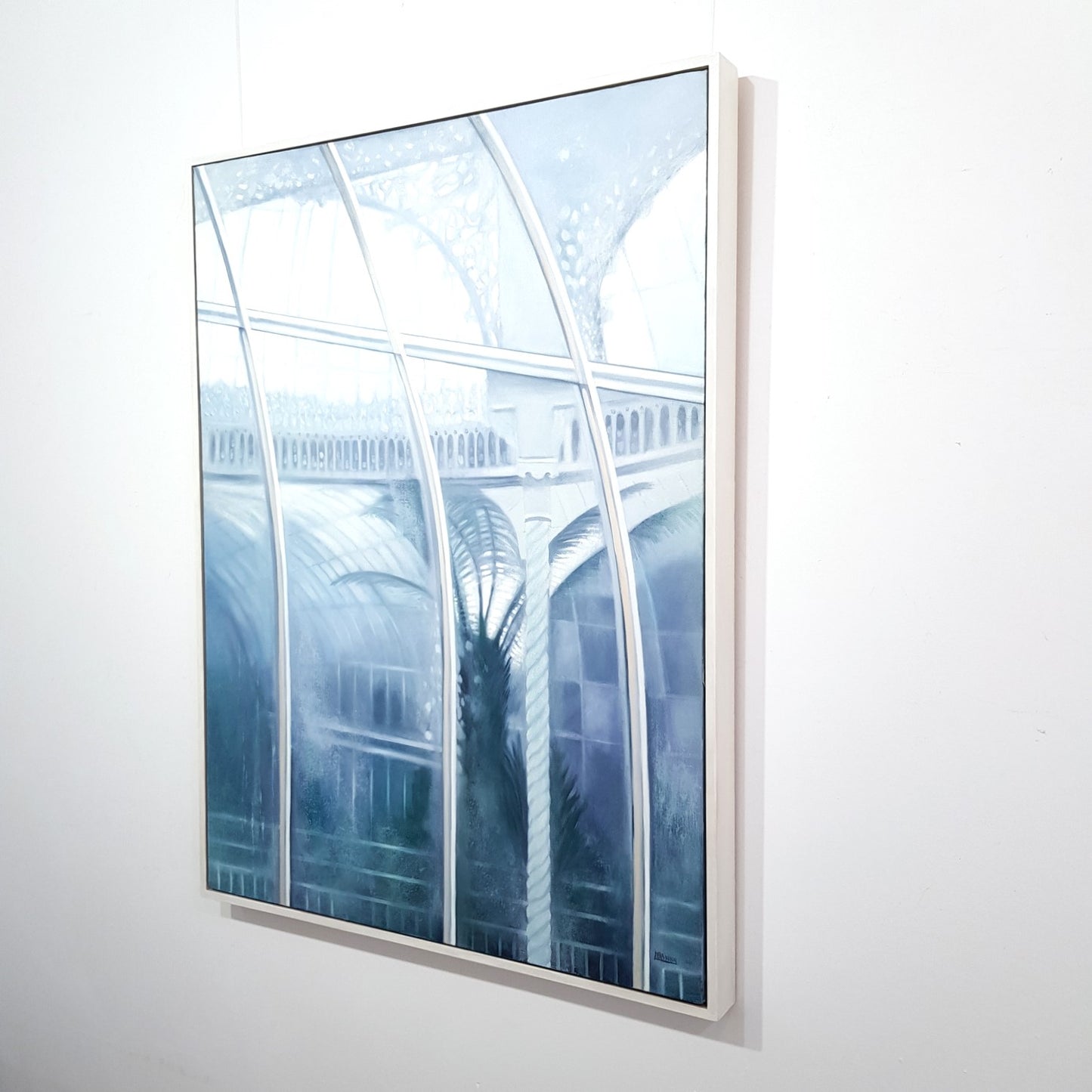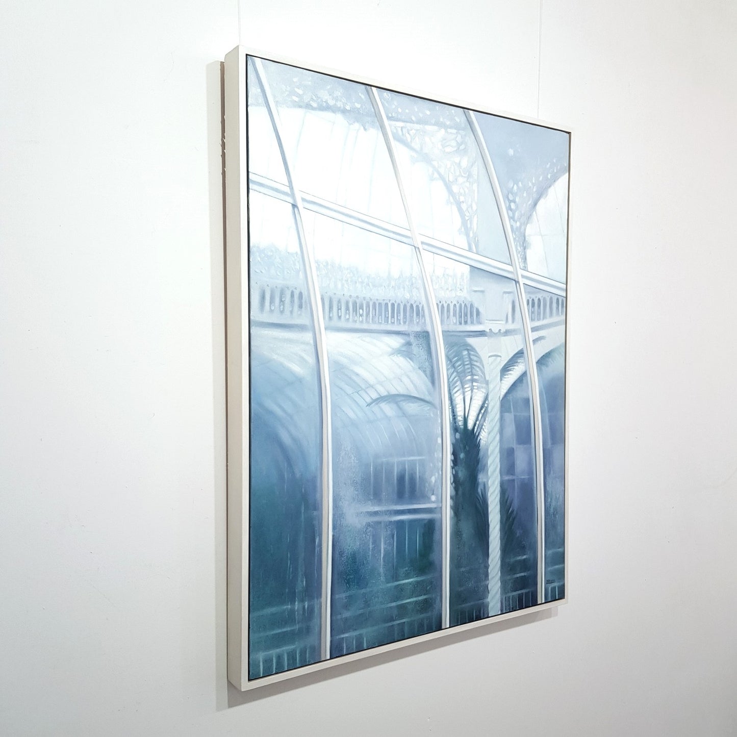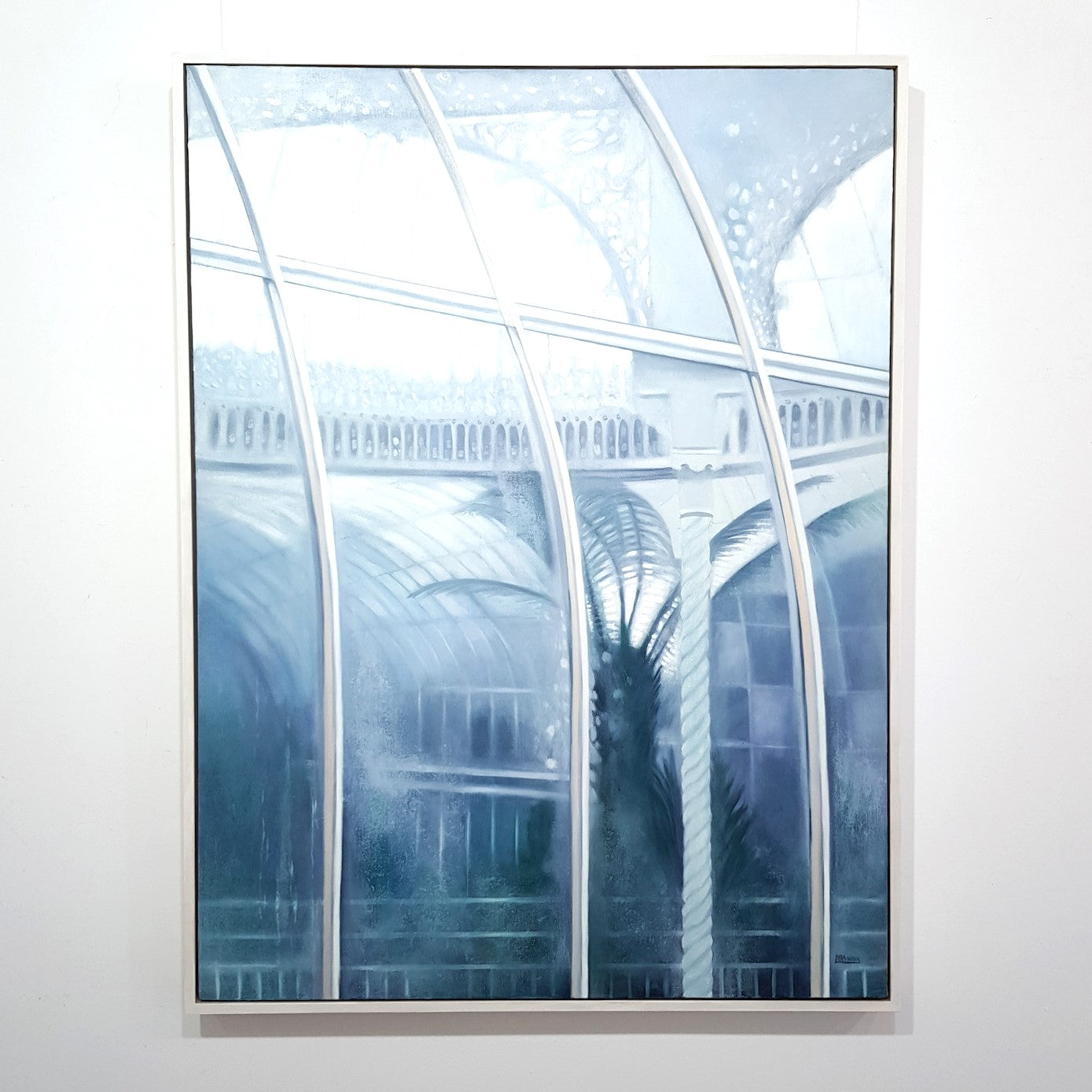 Kibble Palace, Looking Inwards, Misty Morning: An original oil painting of the historical greenhouse Kibble Palace in Glasgow's Botanic Gardens. Available for purchase now with worldwide delivery.