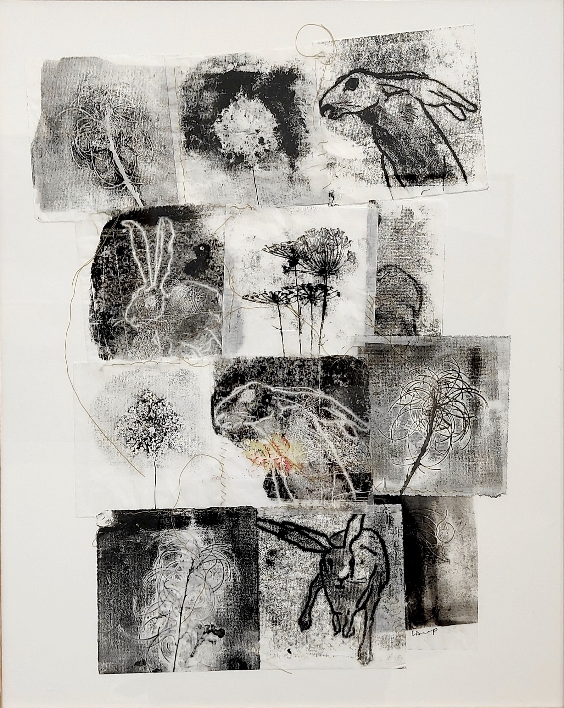 Bound with delicate thread, Lisa Pettersson's collage contains beautiful textures and papers, depicting wildflowers and a curious hare.