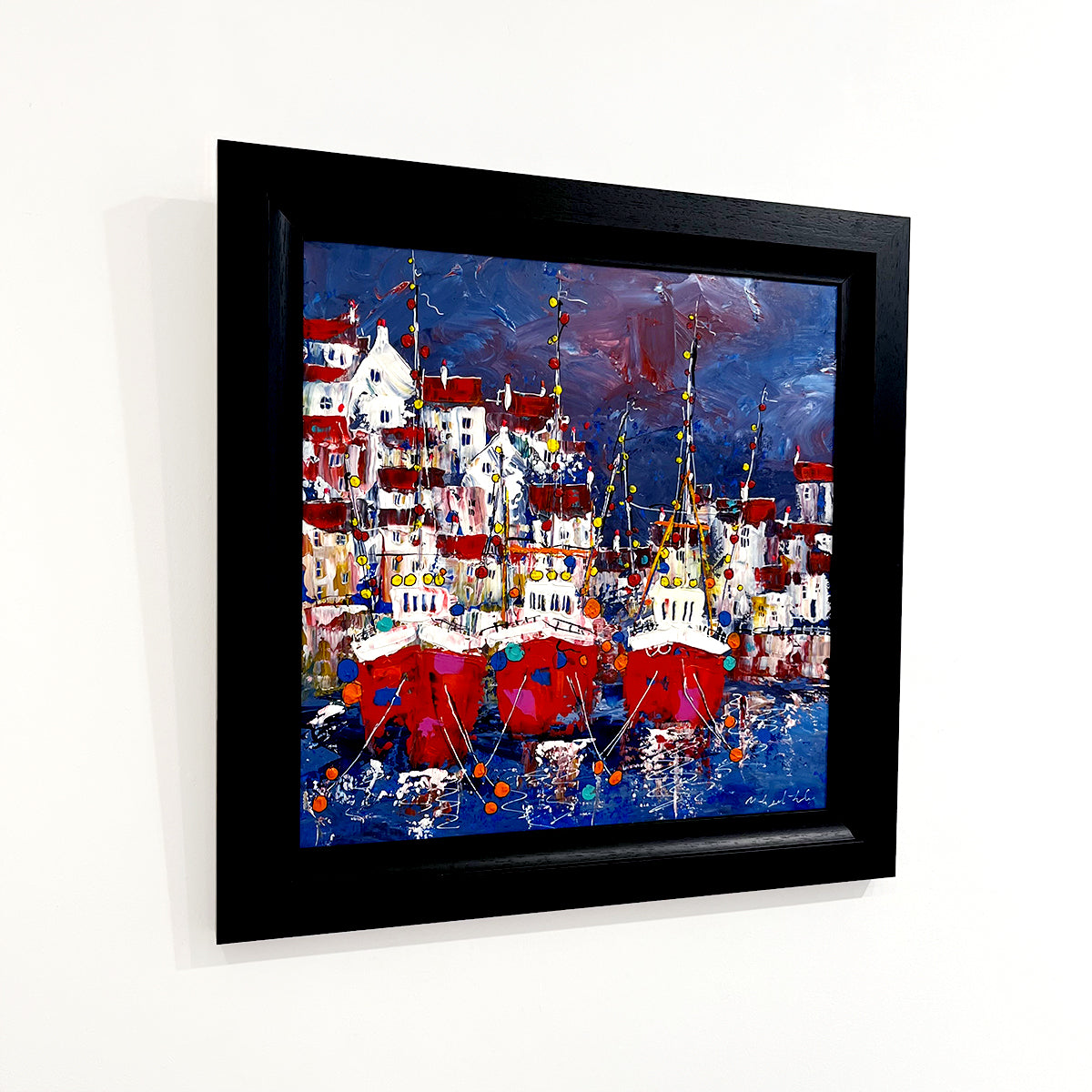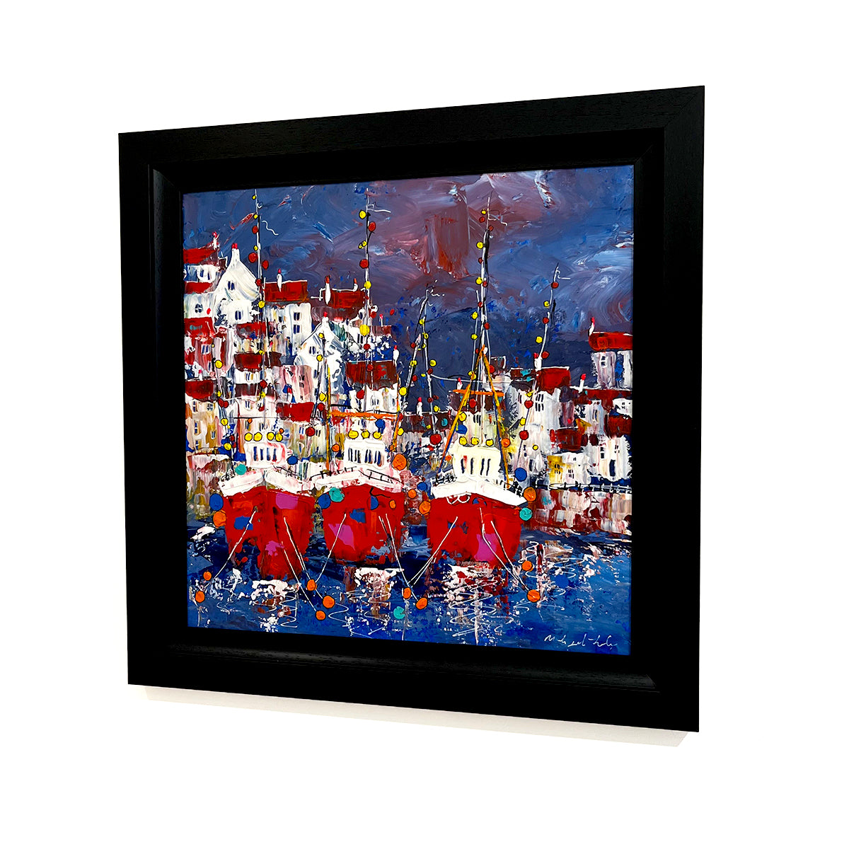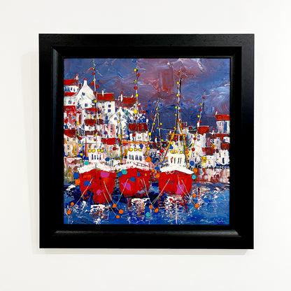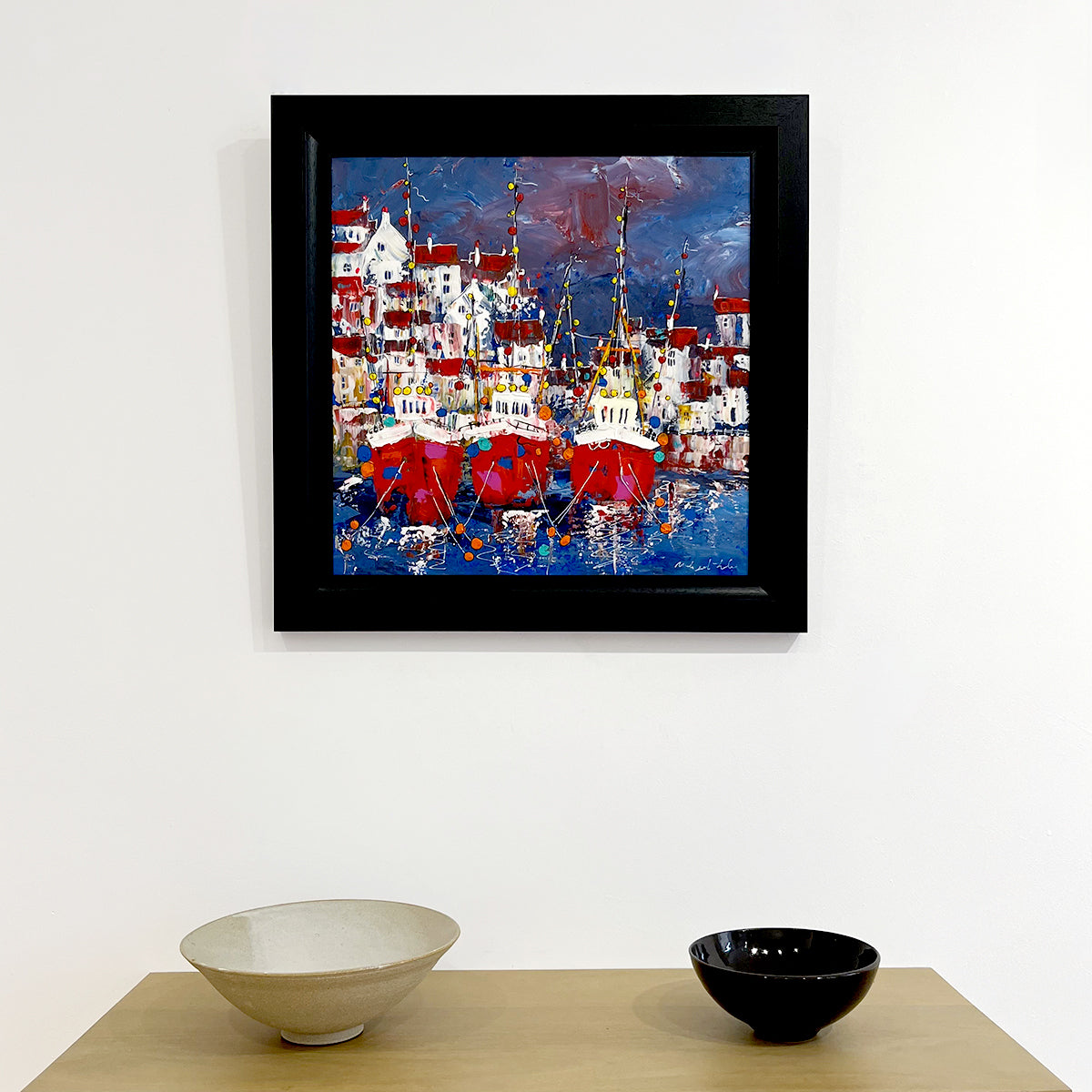 Red echoes through this striking seascape: on the boats, the rooftops and seeping into the sky.