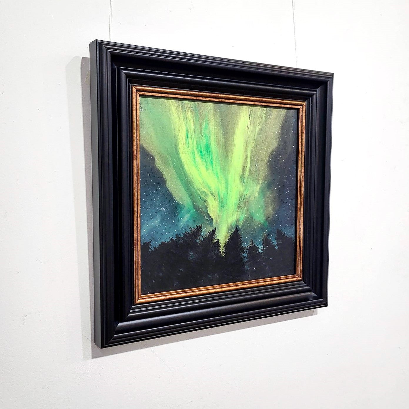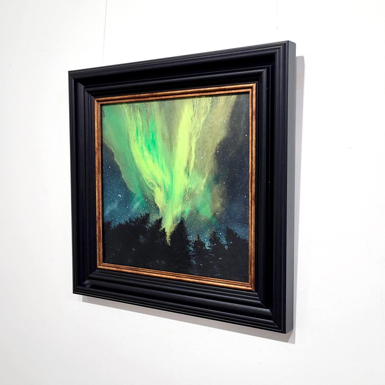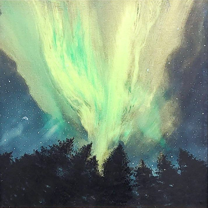 An original Scottish painting of the green hues of the Northern Lights above the treeline. Available now with free worldwide delivery.