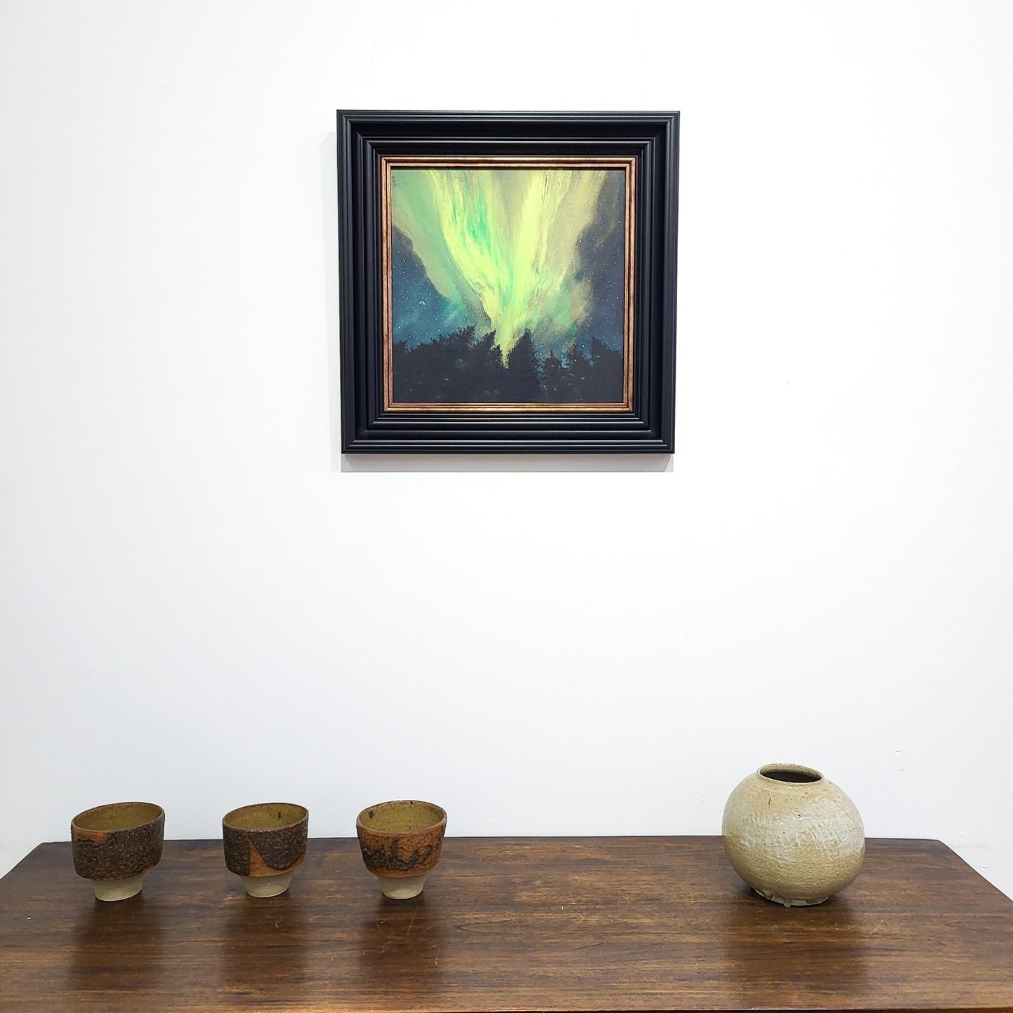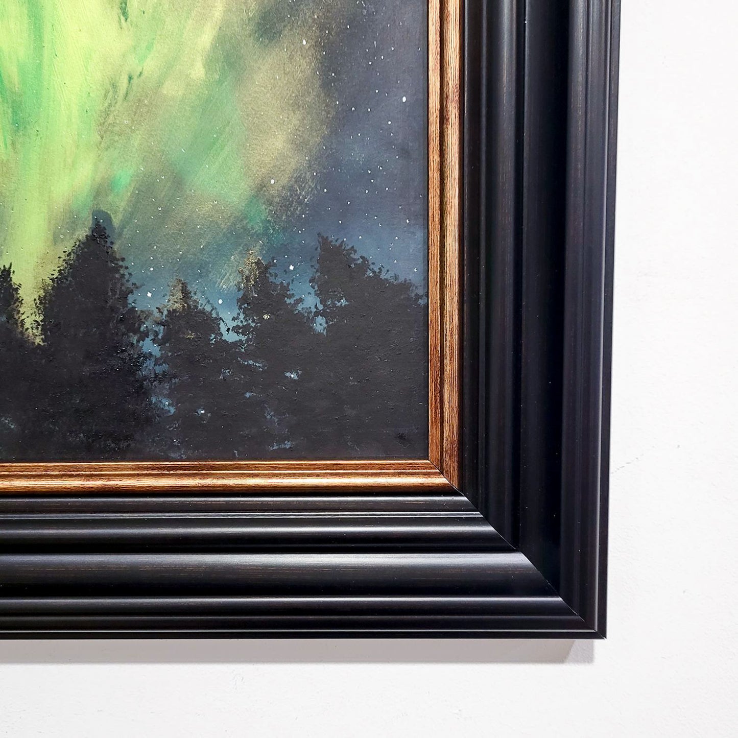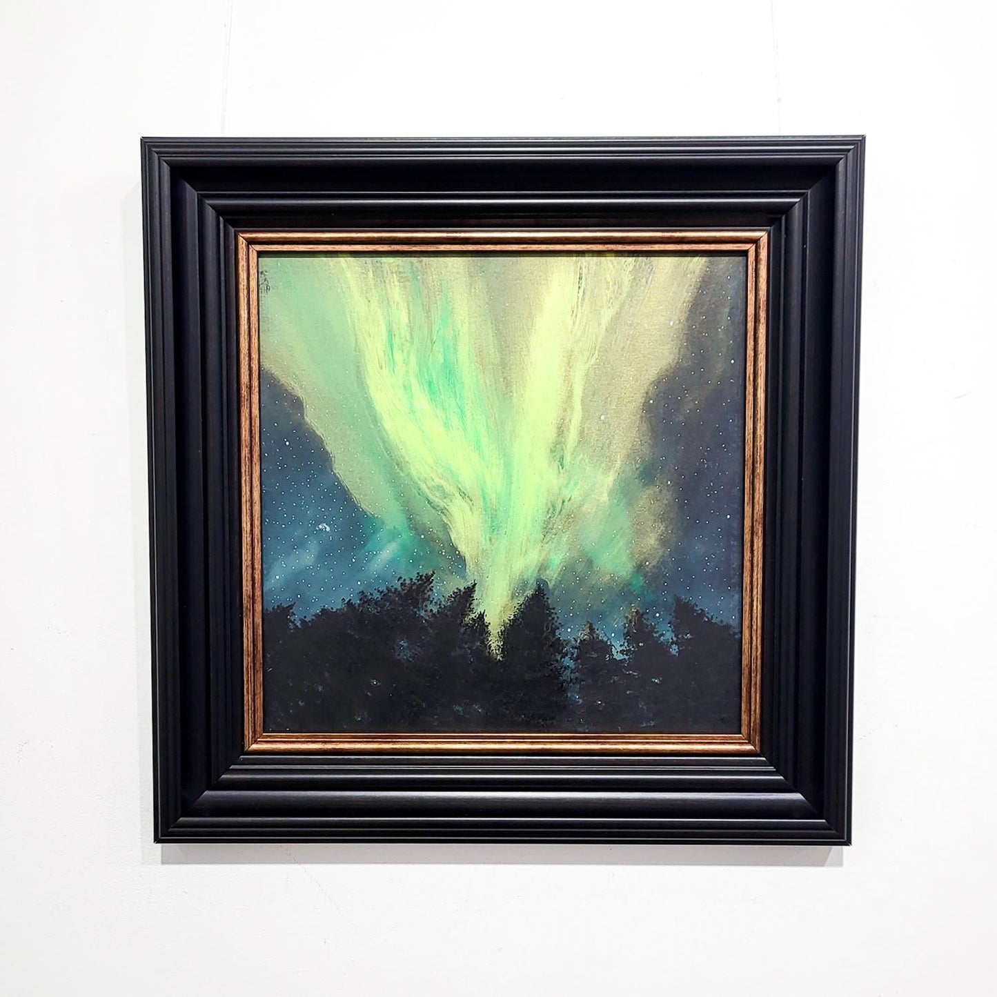 An original Scottish painting of the green hues of the Northern Lights above the treeline. Available now with free worldwide delivery.