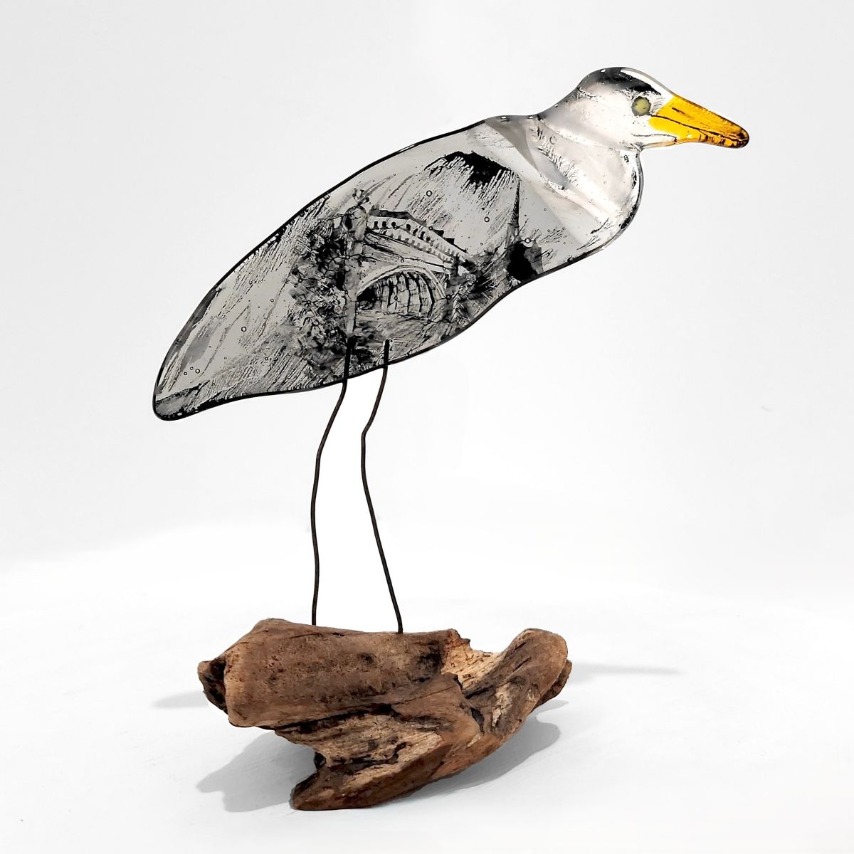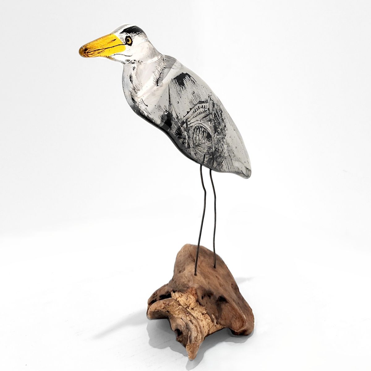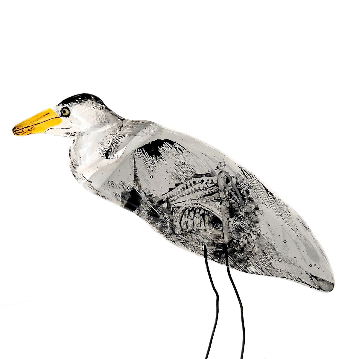 An etching of Glasgow's Kelvinbridge appears within the form of a grey heron, often spotted perched on the banks of the River Kelvin.