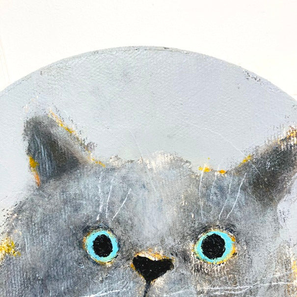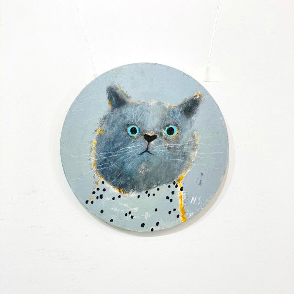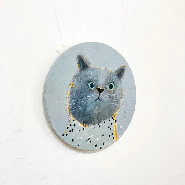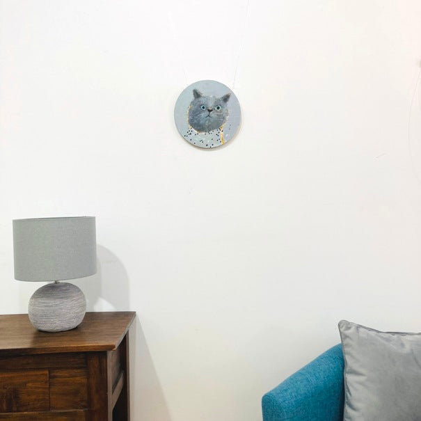 An incredibly characterful original acrylic painting of a grey cat wearing a spotty shirt - the perfect gift for the cat lover in your life! Available in the UK with free international delivery.
