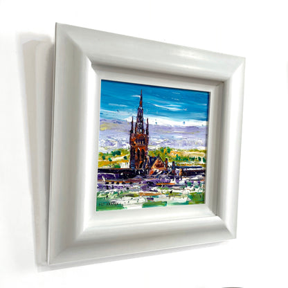 The University of Glasgow's iconic spire is dappled with light rain fall.