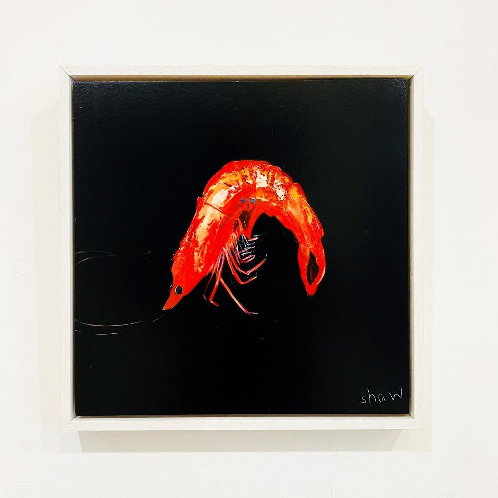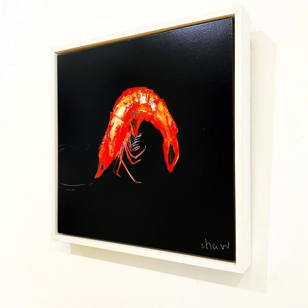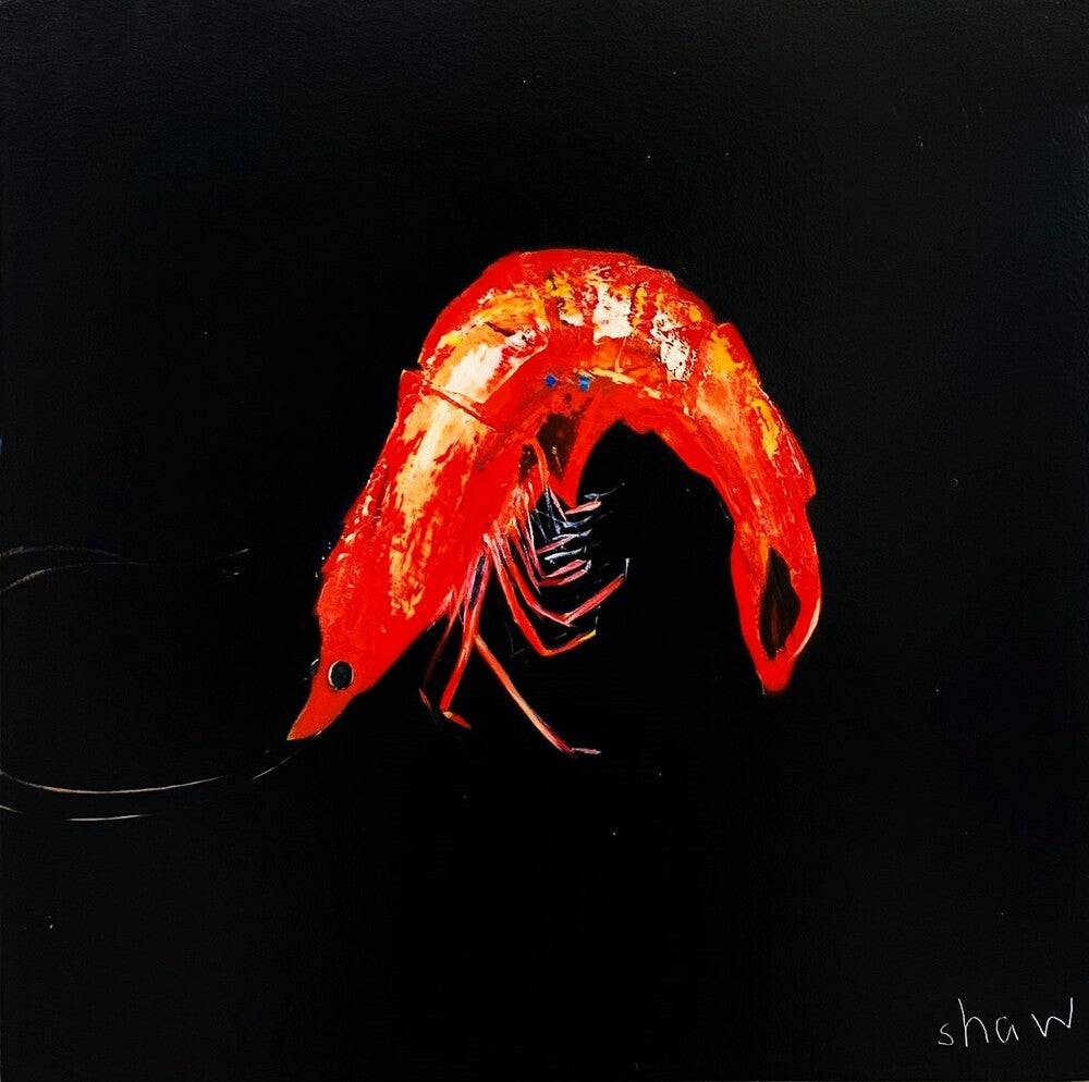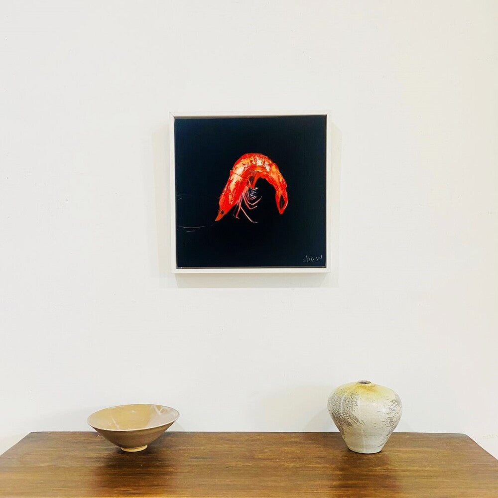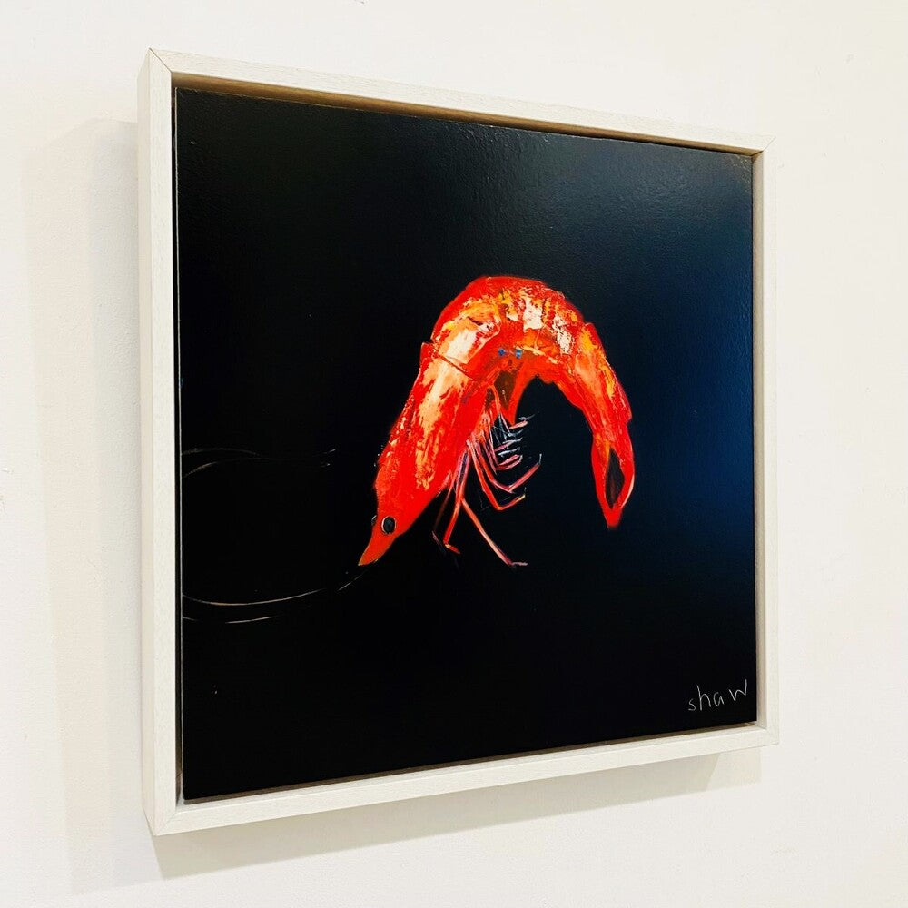 Prawn: A characterful prawn against a statement black background. Available to purchase online and in-gallery.