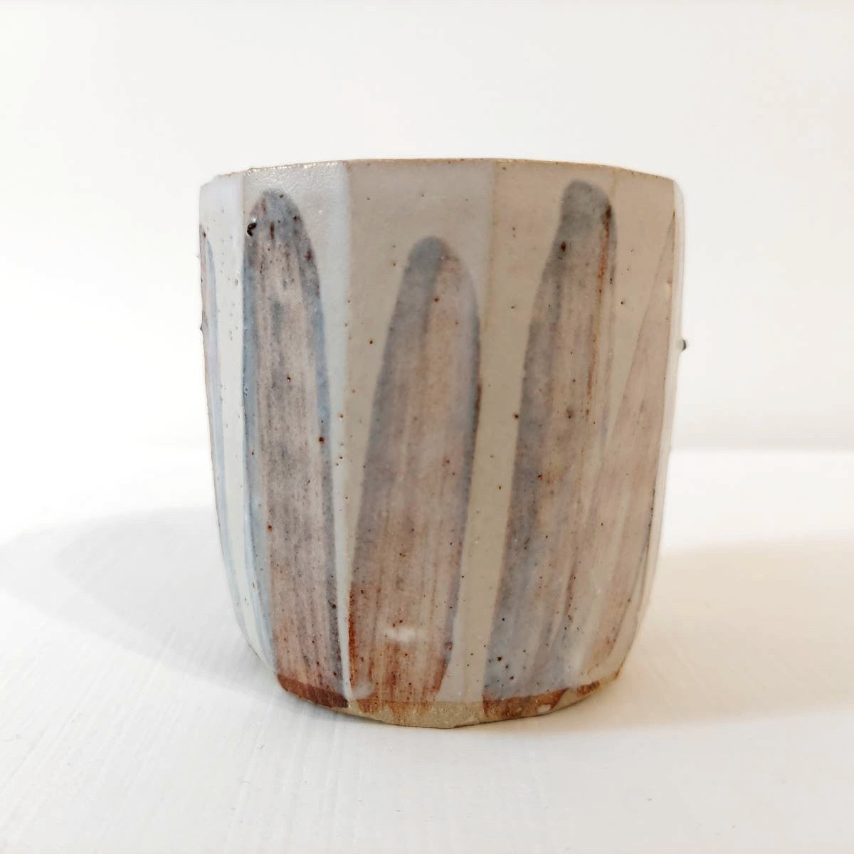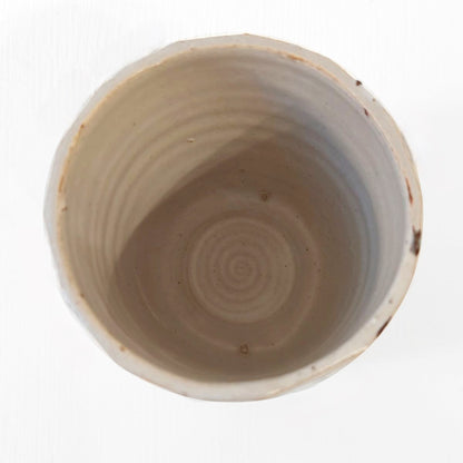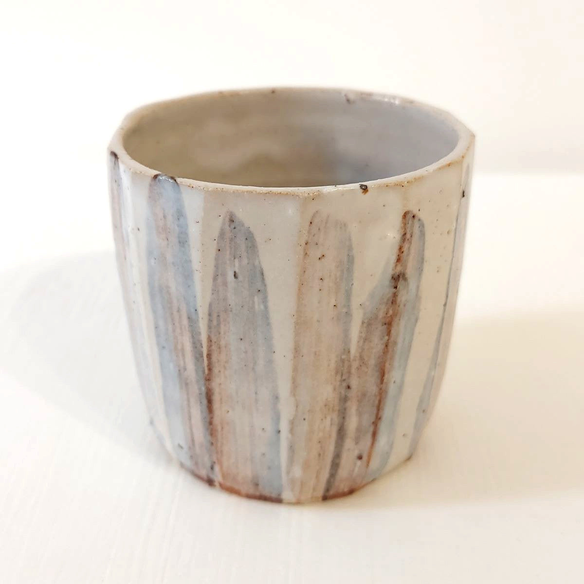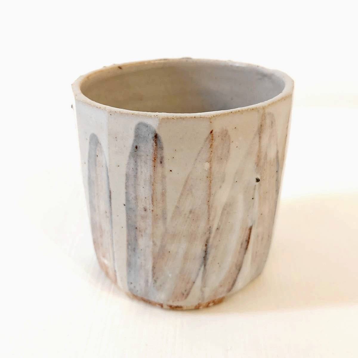 A handcrafted cup, brown brushstrokes muted by a natural off-white glaze.