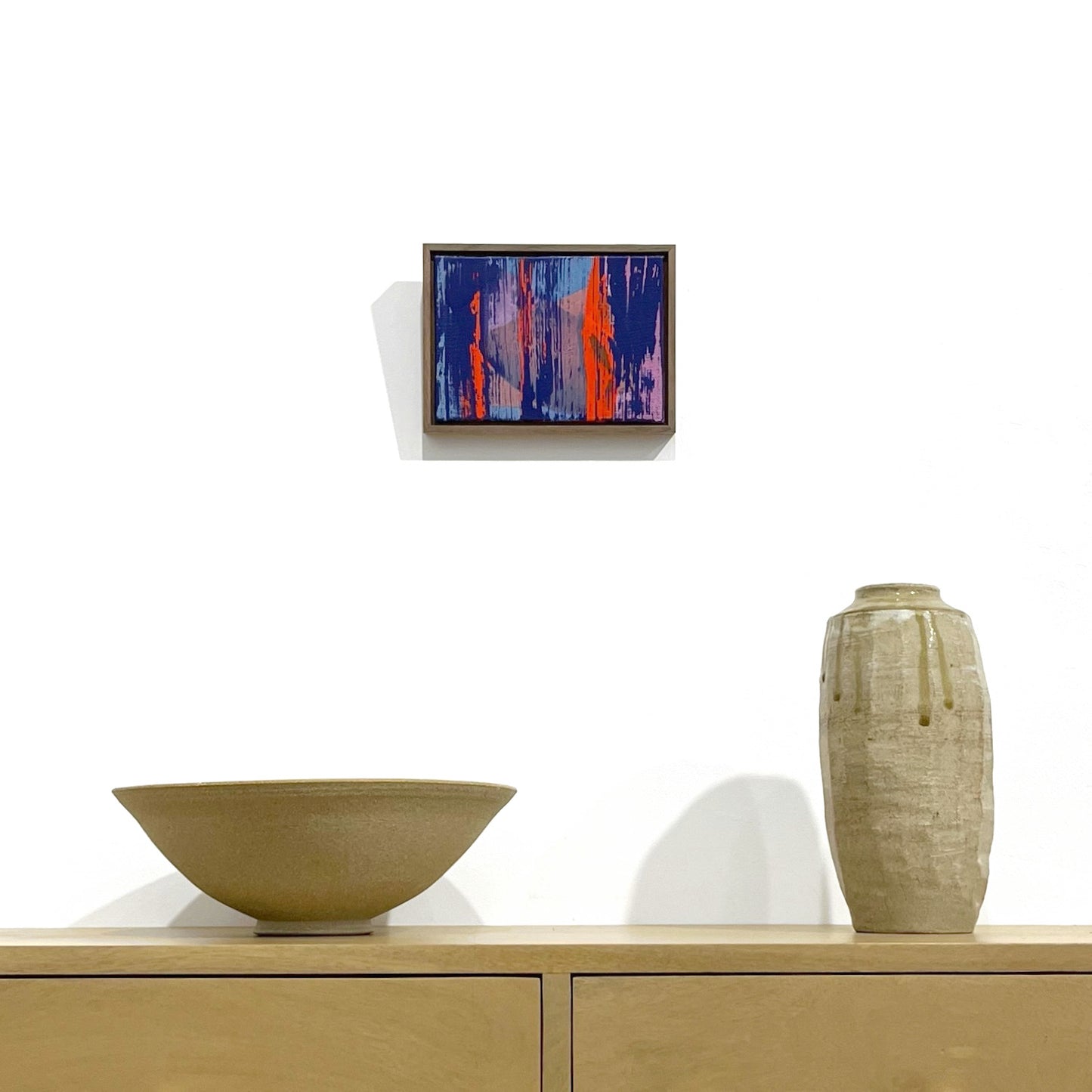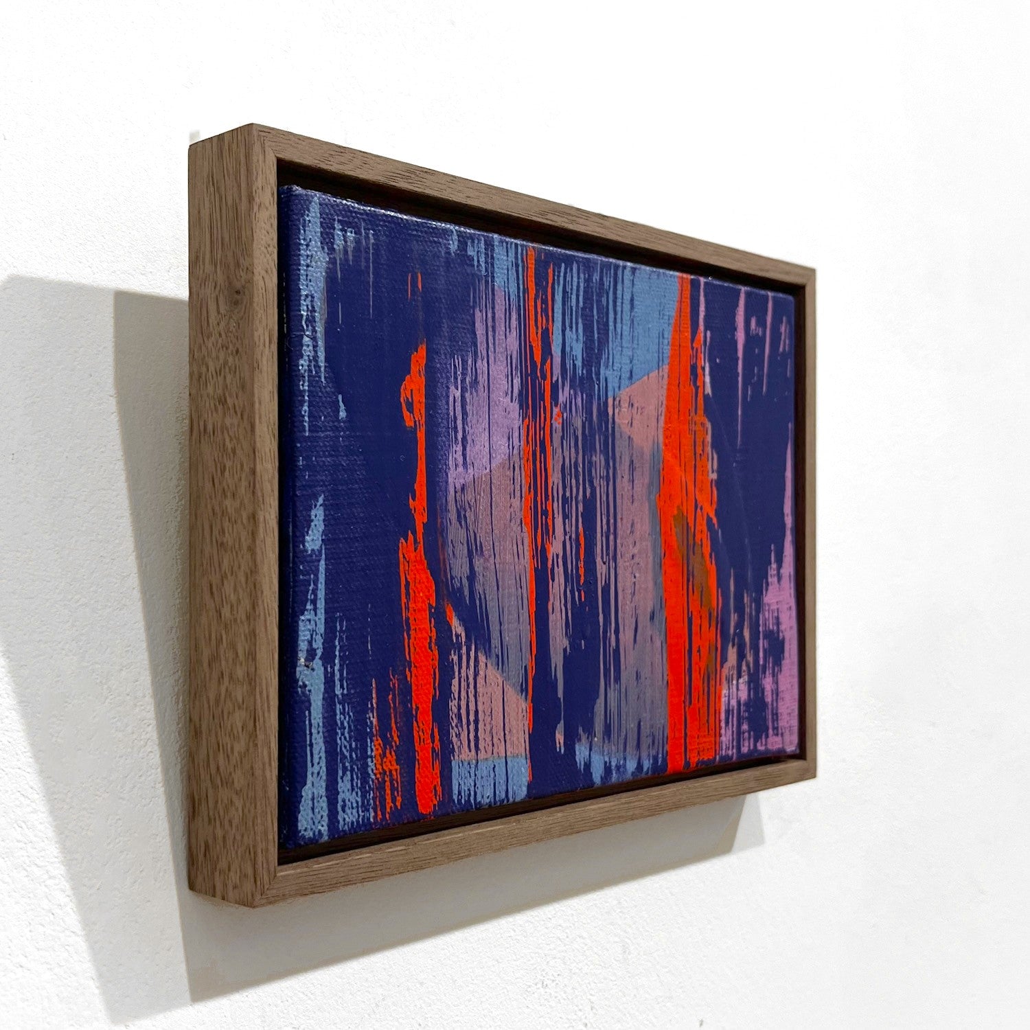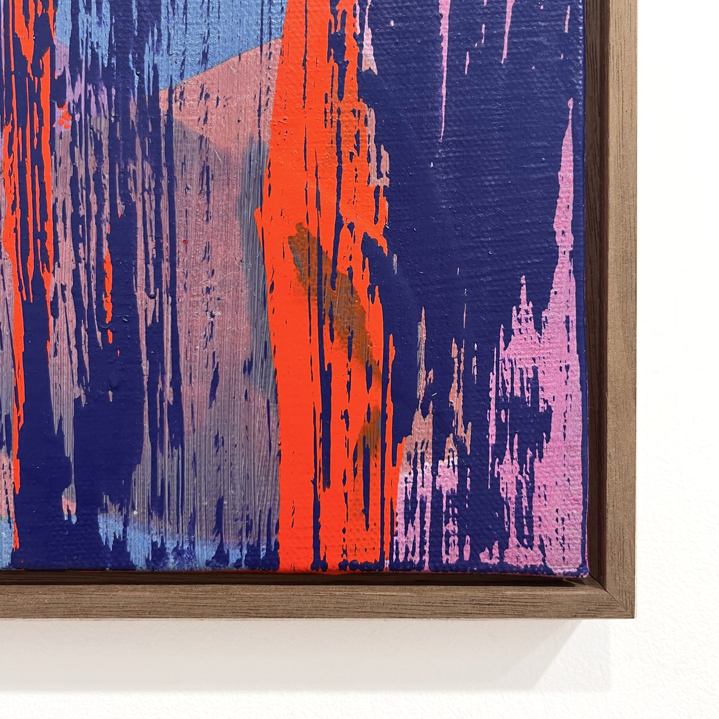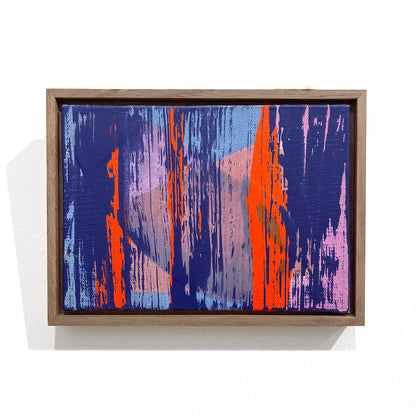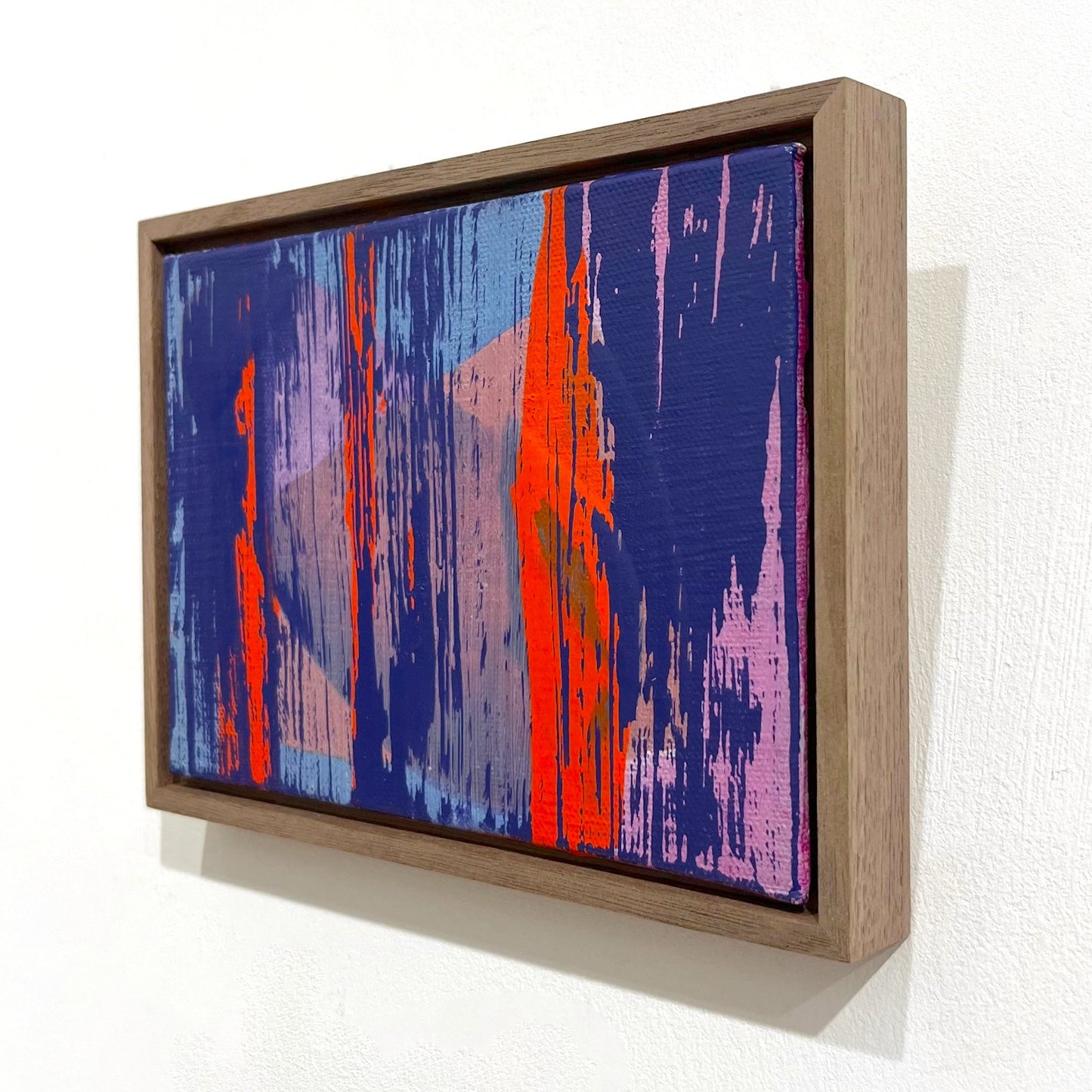 Full of energy, bright reds peek through trails of purple in this small but impactful oil painting.