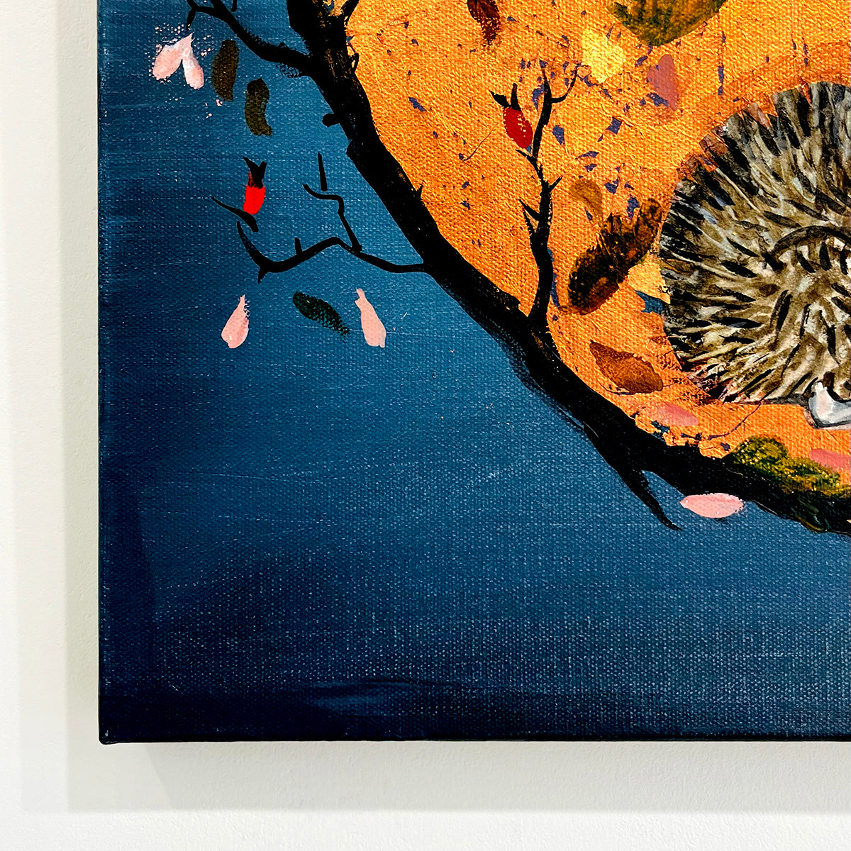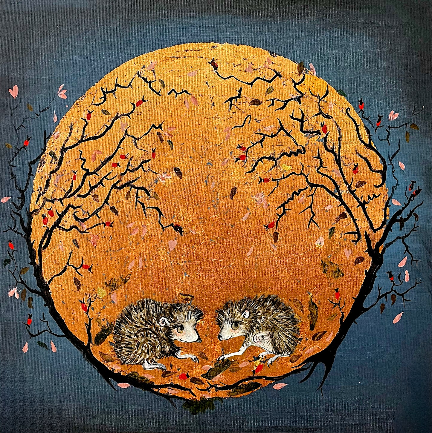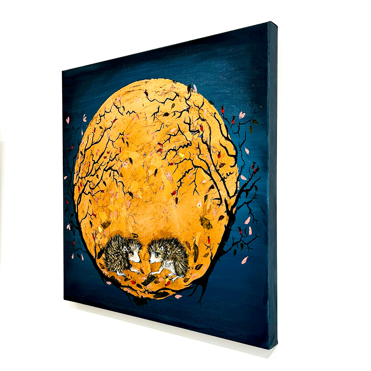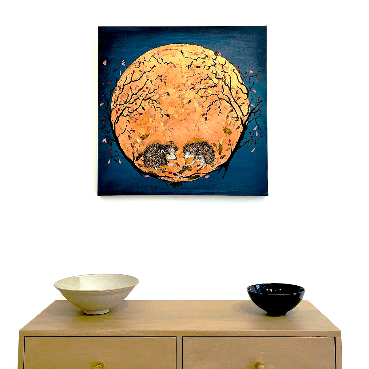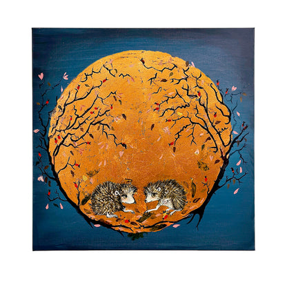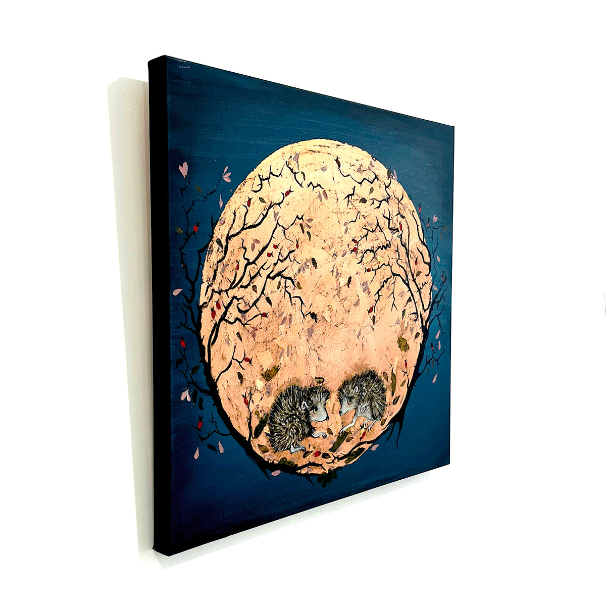 A sweet portrait of two hedgehogs lit by the full moon. Available with complimentary international delivery.