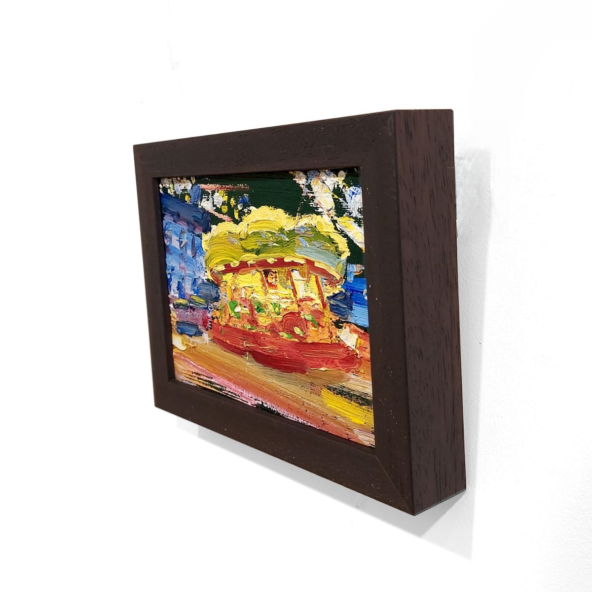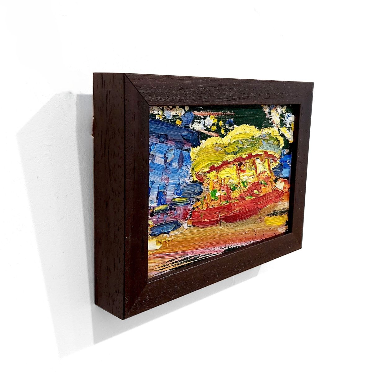 A gleeful scene of a spinning carousel portrayed in impressionistic brushwork.