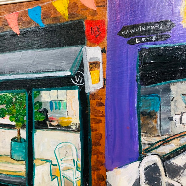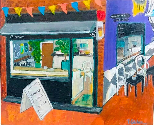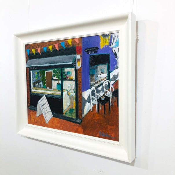 An impressionist acrylic painting of a coffee shop in Brighton, a seaside resort on the south coast of England.