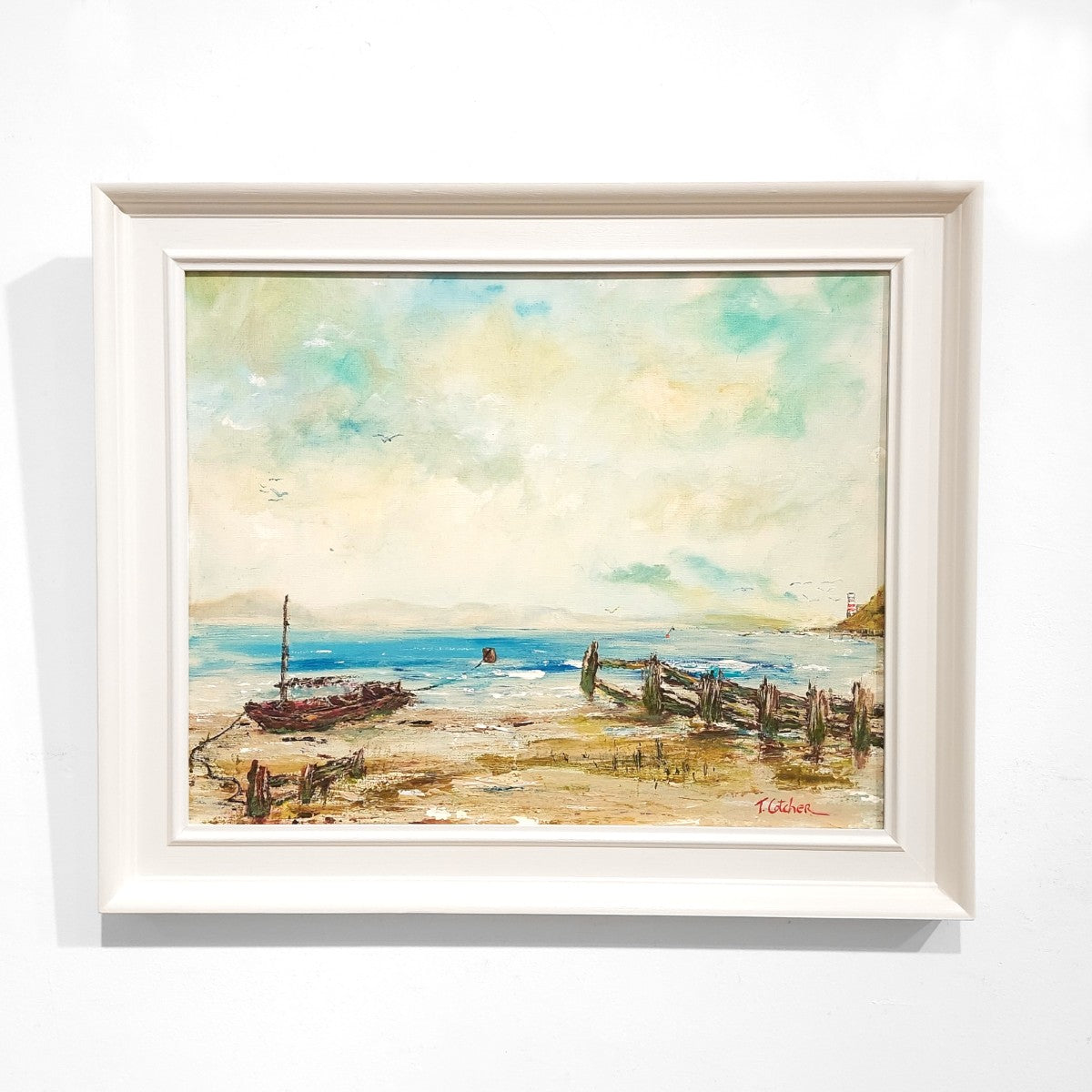 A Turner-esque coastal vista awash with hazy blues and greens, tethered by a lonely buoy and its fishing boat.