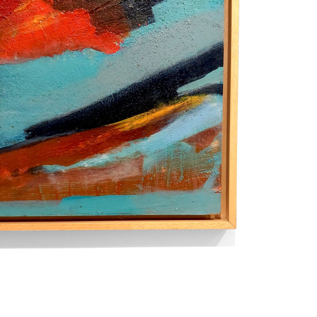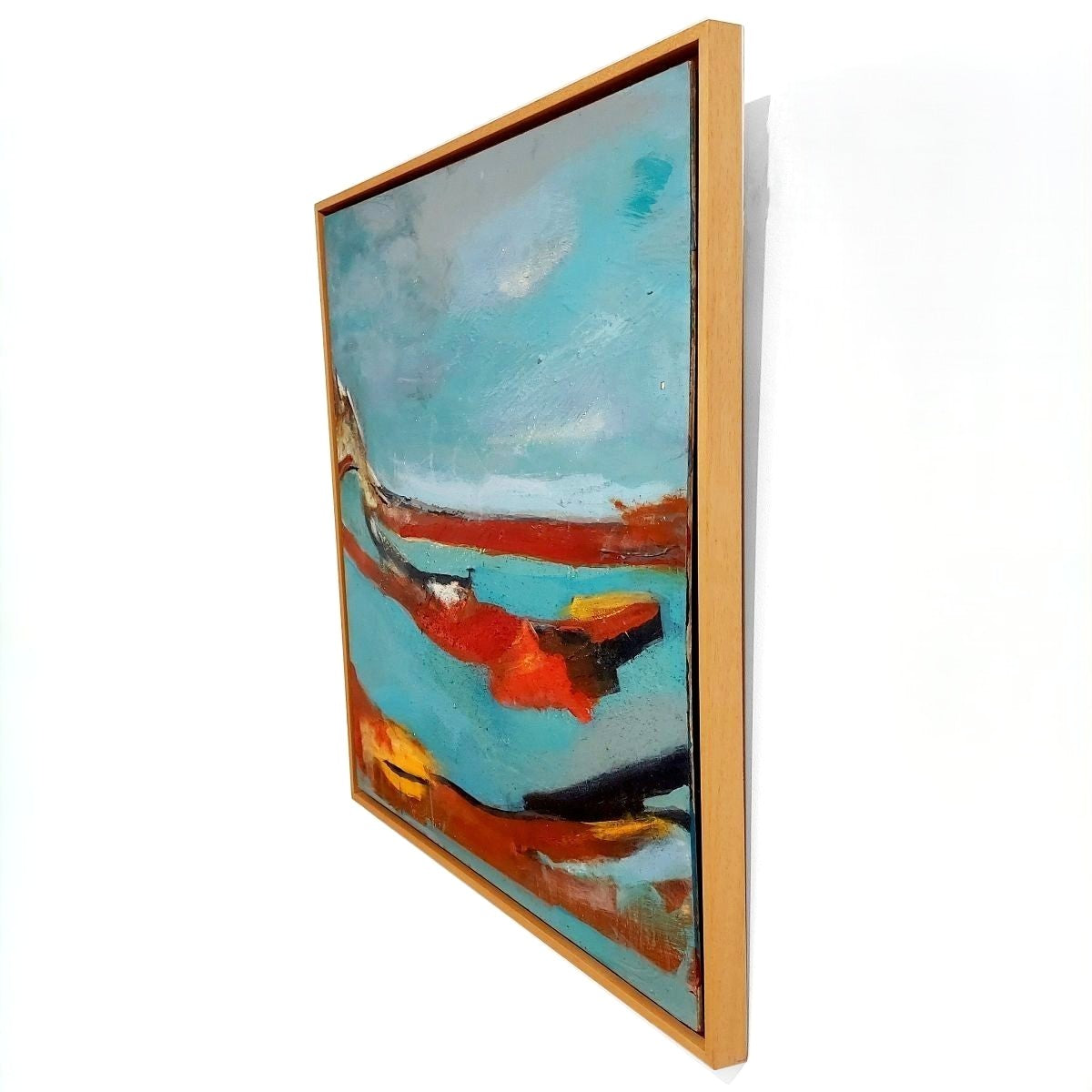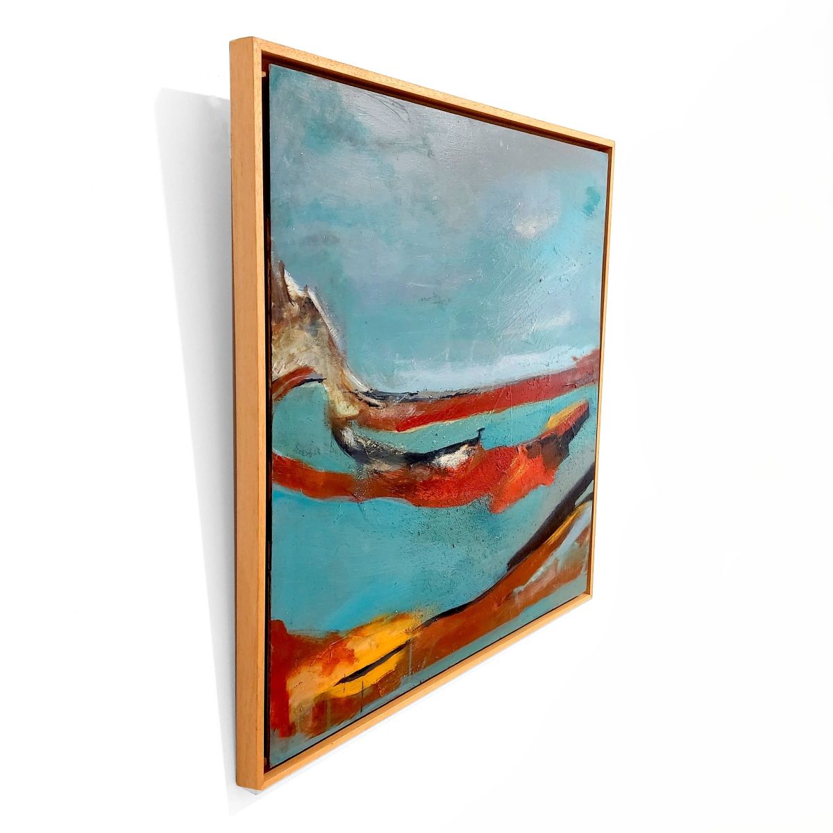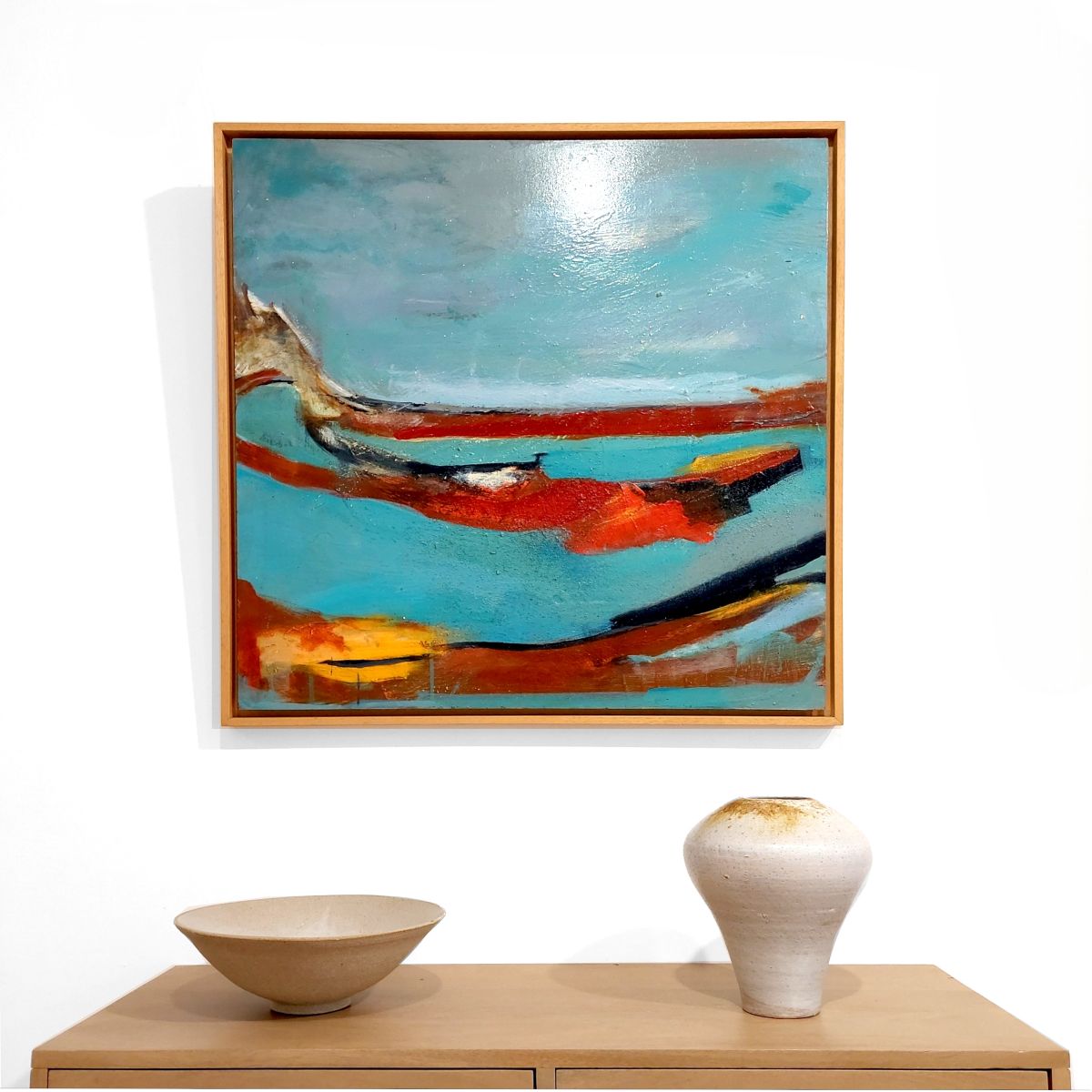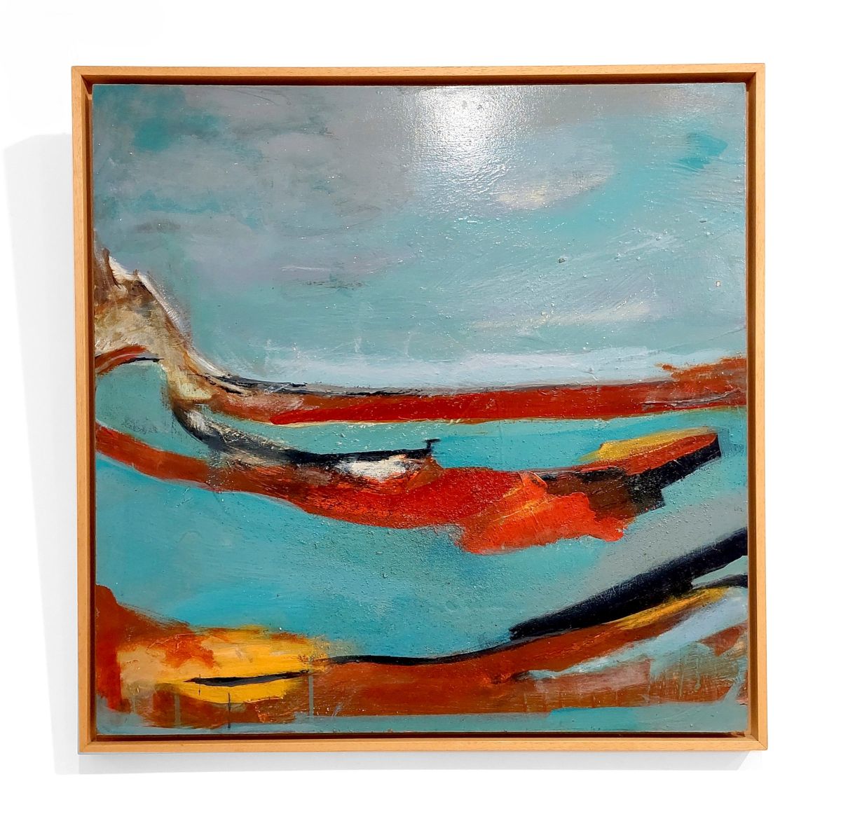 Warm gestural marks dive through an expanse of blue, almost mimicking the rocking motion of the sea.