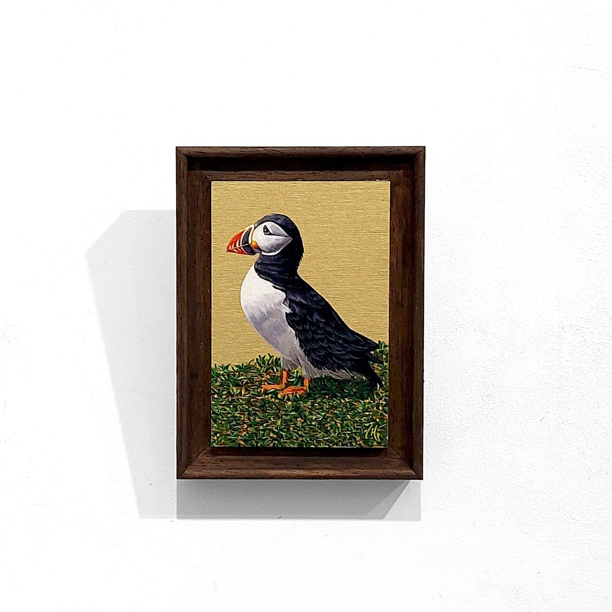 A wee puffin in a wee painting steps out boldly across the grass.