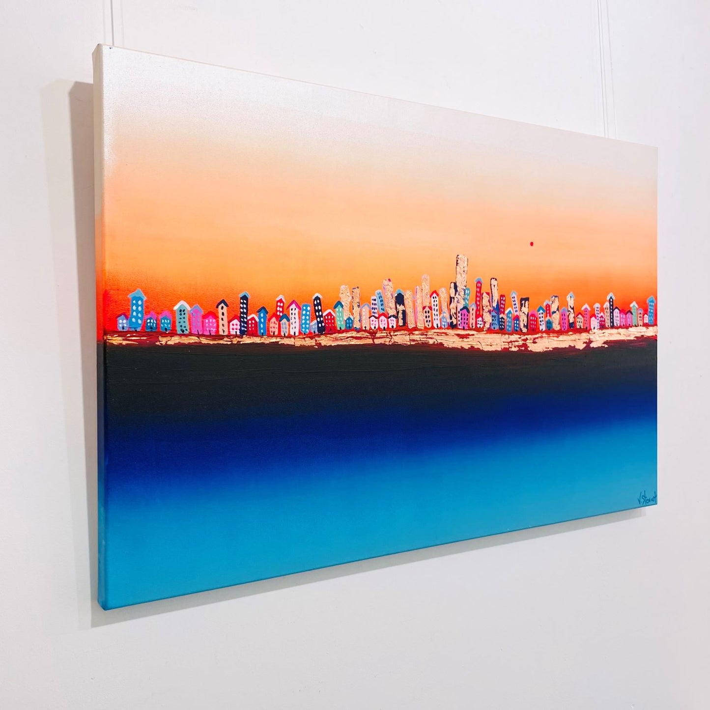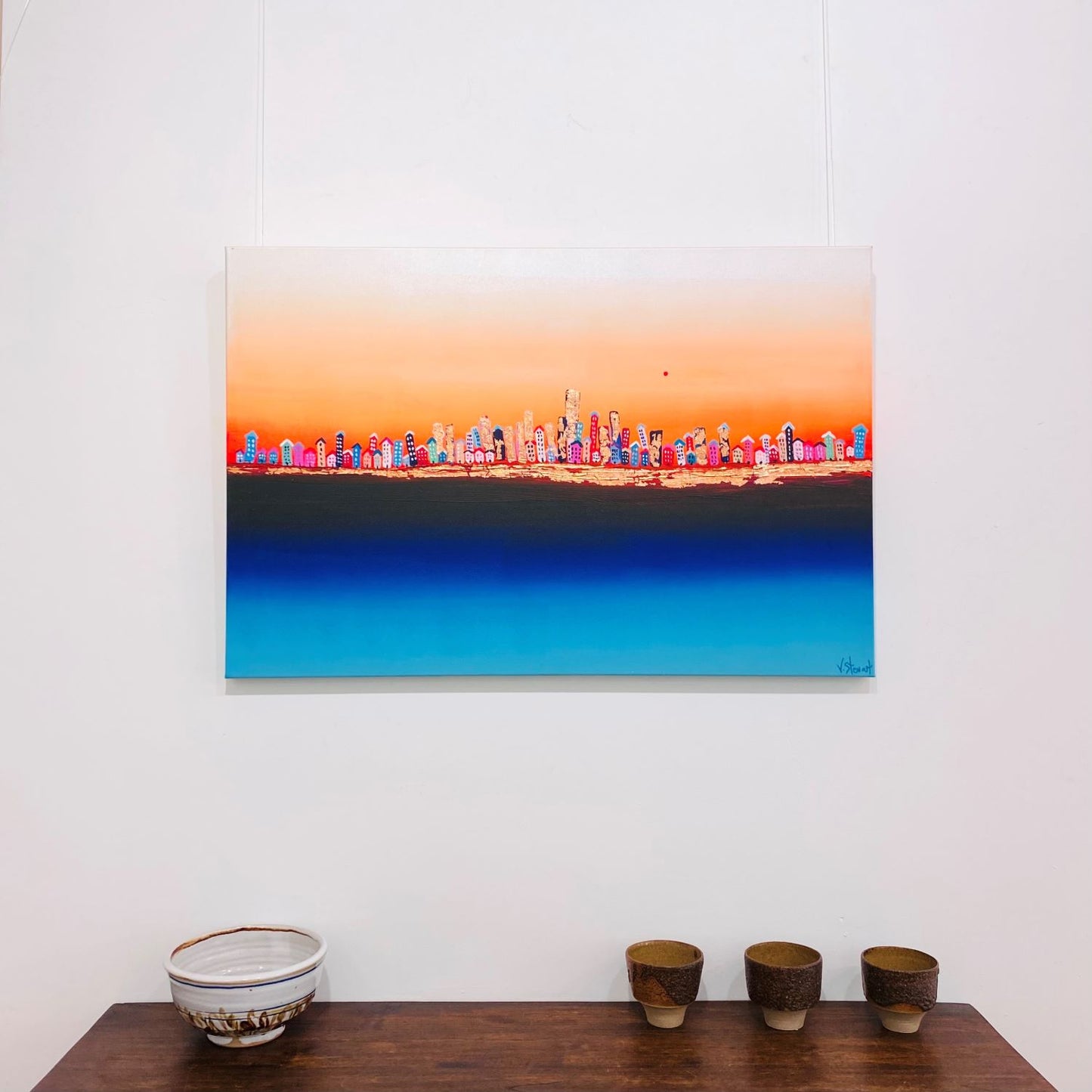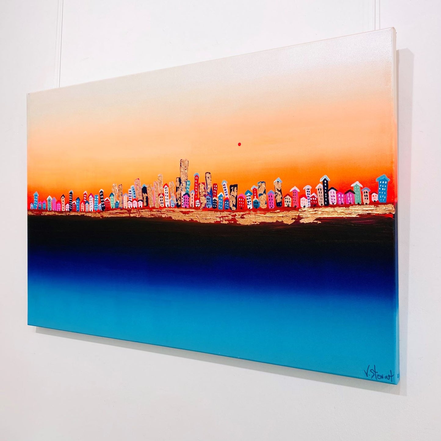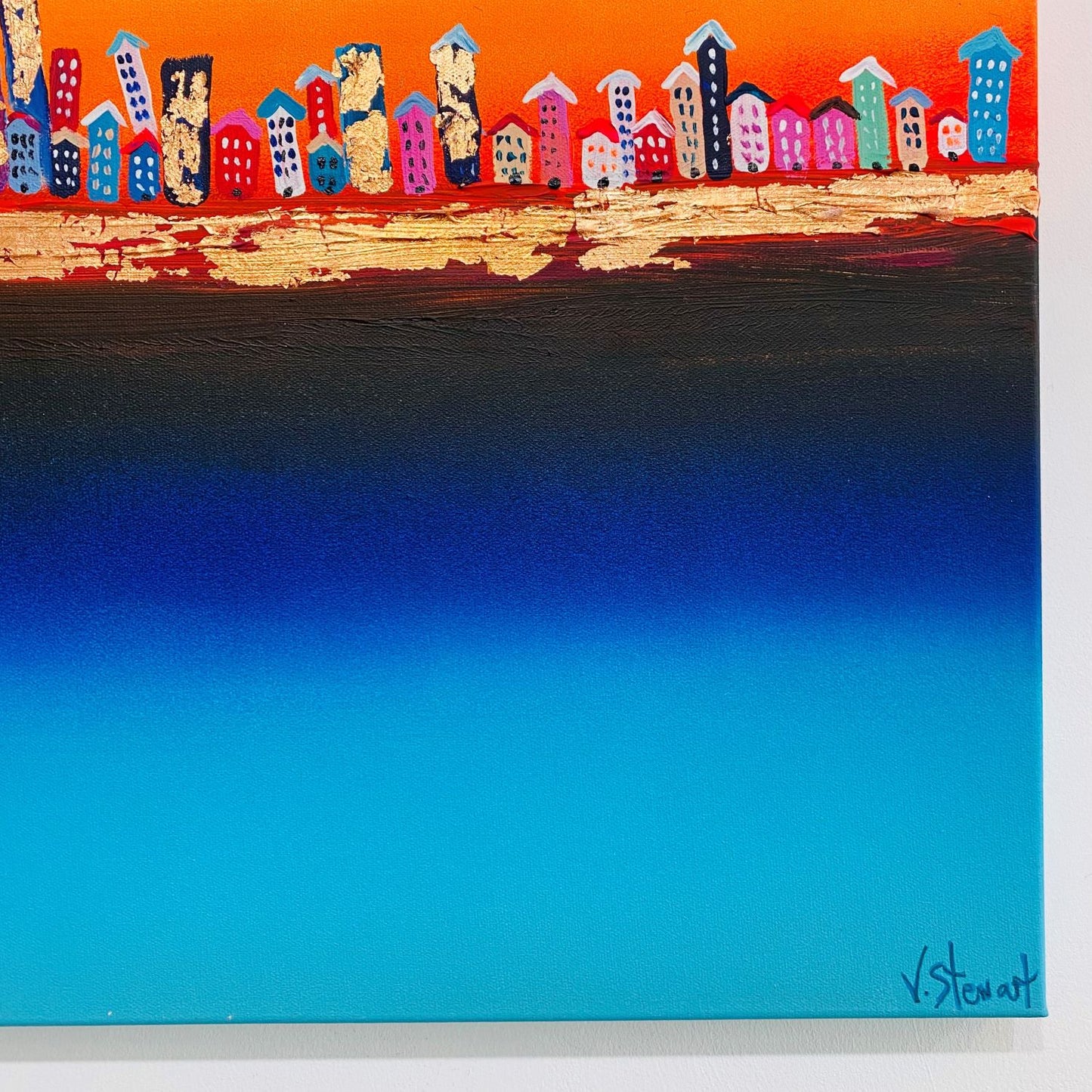She specialises in minimalistic compositions that emphasise her expert use of intense colour to create compelling atmospheres. Her new works have evolved with the addition of charming figures and town landscapes against the almost otherworldly backgrounds. This effect of a populated and captivating scene, achieved with only a few skilled brushstrokes, shows what a capable artist Stewart is.